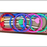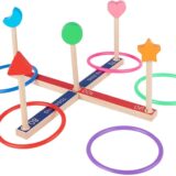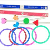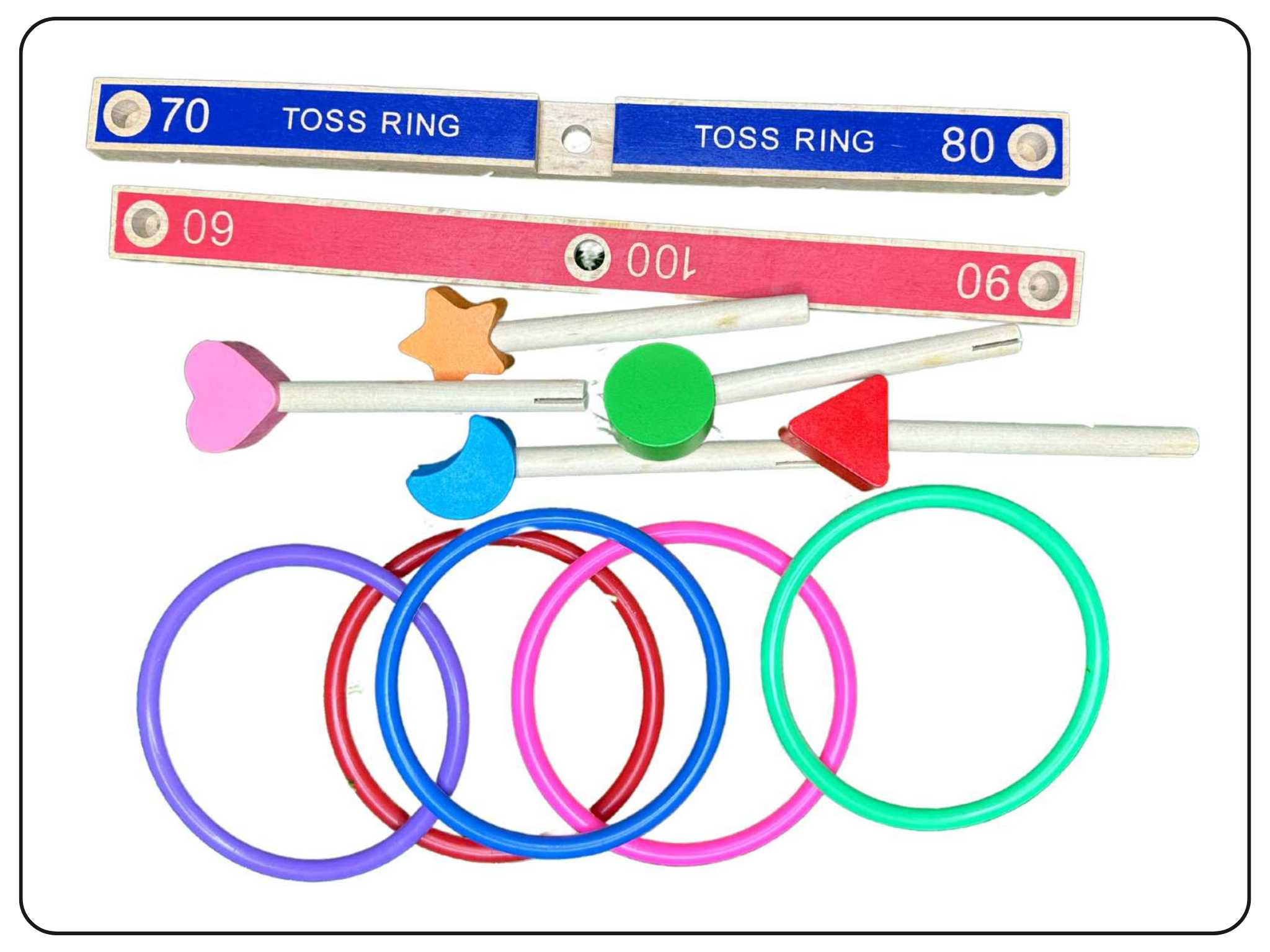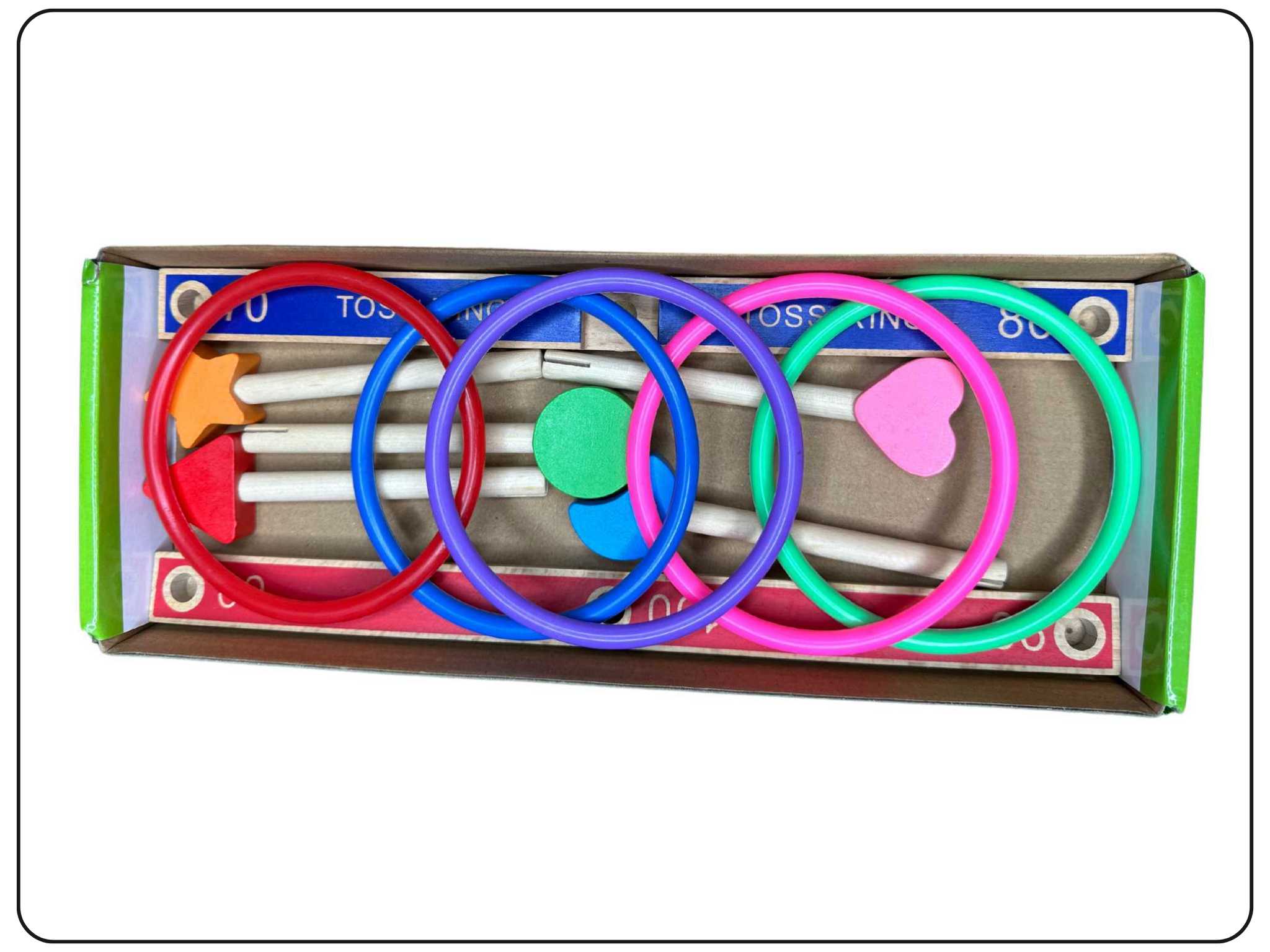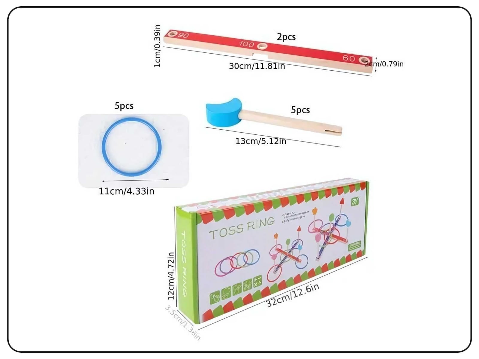 The image shows a Toss Ring game, a classic target game for all ages that helps develop hand-eye coordination. The game can be played indoors or outdoors and usually involves tossing rings onto a set of pegs or hooks to score points.