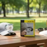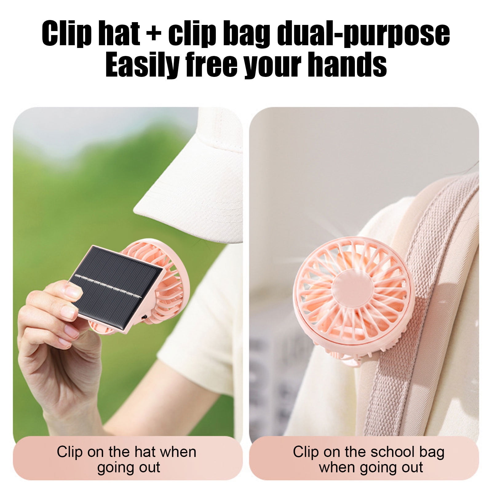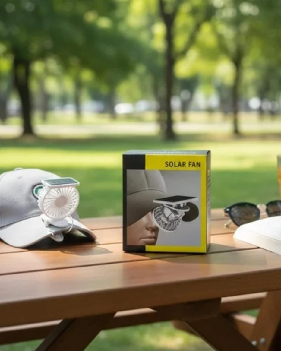 This is a portable solar-powered clip-on fan. The device can be clipped onto a hat, backpack, or clothing for hands-free cooling during outdoor activities. Some models may also include a built-in rechargeable battery for use without direct sunlight.