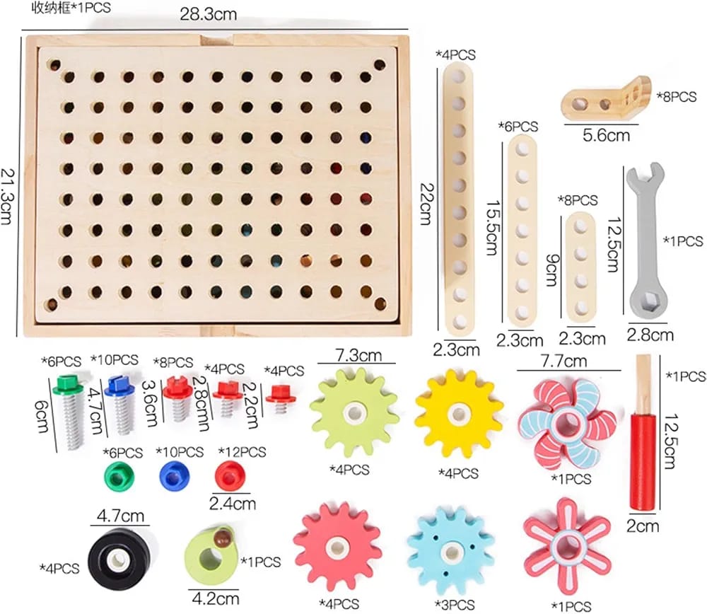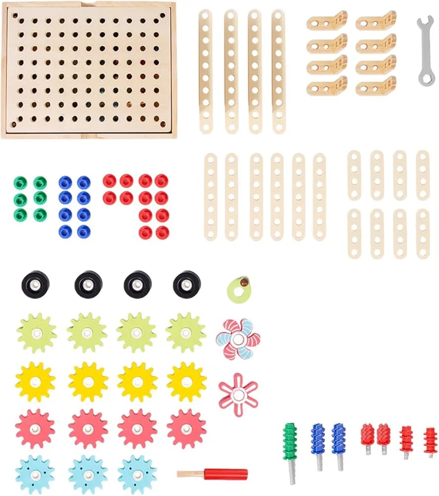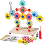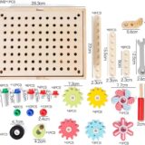 Activities include rotating gears, assembling nuts and bolts, and a nut and ball maze.