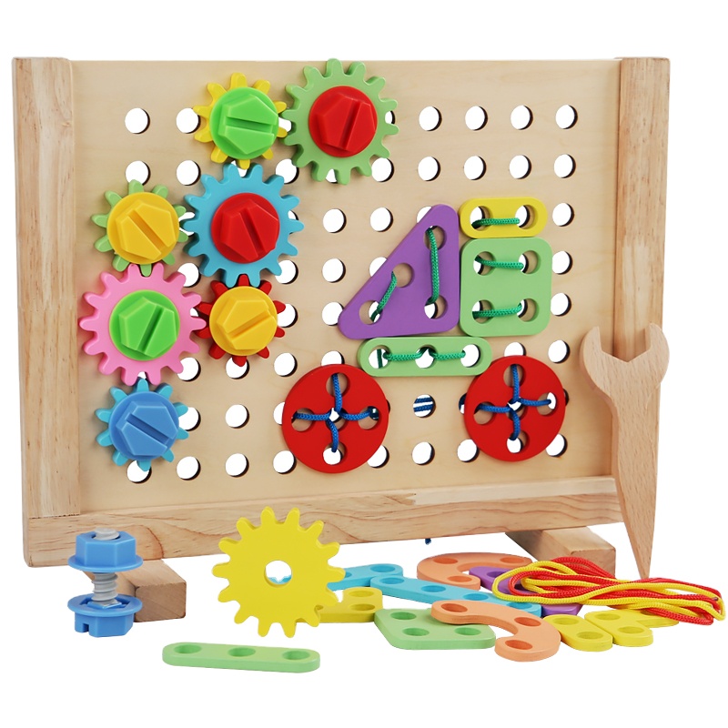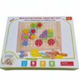 The product in the image is a Multifunctional Gear Nut Toy, a wooden activity board designed for early education and skill development. It is a 4-in-1 toy that offers several interactive activities.