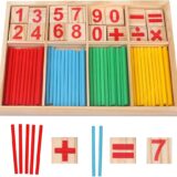 Material: The set is made of wood. Contents: The product typically includes a wooden storage box, colored counting rods (red, yellow, green, blue), number cards (0 to 9), and mathematical symbols. Educational Use: It is suitable for home, preschools, and kindergarten settings. It helps teach fundamental math operations, including addition, subtraction, multiplication, and division. Learning Benefits: The toy provides a tactile learning experience that helps children visualize numbers and their relationships, making abstract ideas more concrete. It exercises thinking ability, color perception, eye-hand coordination, and imagination. Engagement: The design makes learning fun and stimulates children's interest in mathematics.