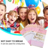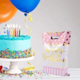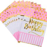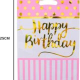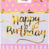 The image displays a fan of several “Happy Birthday” themed loot bags, typically used for party favors. The primary visible bag is a mix of pink and white. The top section is a vibrant pink with gold polka dots, while the bottom section features pink and white vertical stripes. A prominent “Happy Birthday” message is written in a stylish gold script across the center.