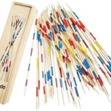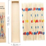 The image shows a set of Mikado sticks, a classic game of skill also known as pick-up sticks. The game involves players taking turns to remove individual sticks from a randomly dropped pile without moving any of the others.