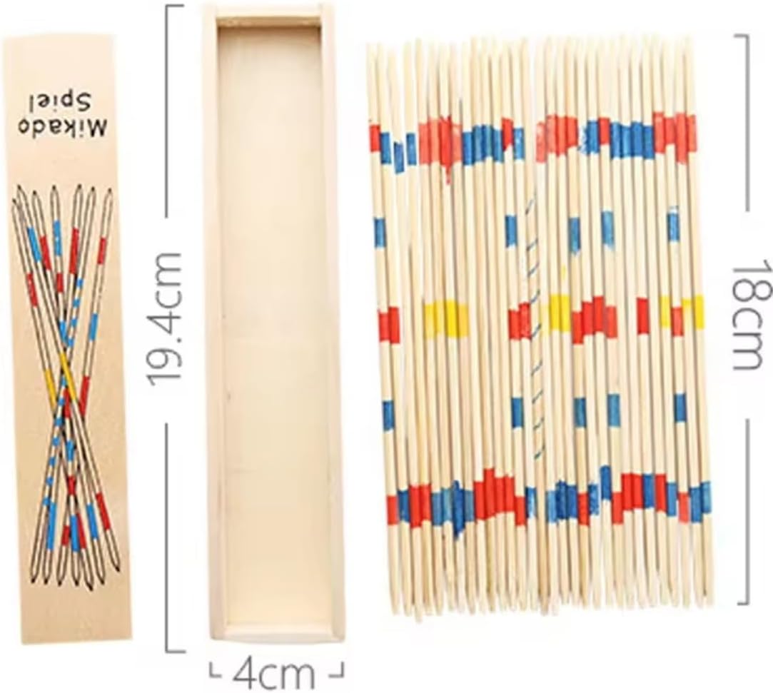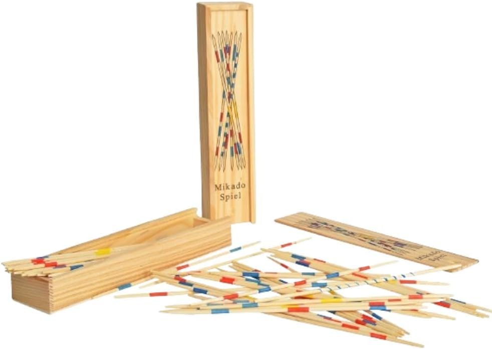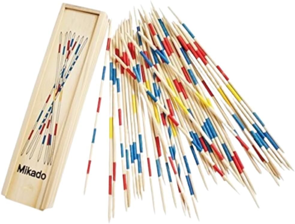 The sticks are bundled together in one hand, held vertically, with the fist resting on a flat surface. The hand is then suddenly opened to let the sticks scatter into a pile. Gameplay: Players take turns attempting to pick up one stick at a time. The key rule is that no other stick in the pile can be moved or disturbed during this process. Turns: If a player successfully removes a stick without disturbing the rest, their turn continues. If any other stick moves, the turn ends immediately, and play passes to the next player. Using a Helper: The "Mikado" stick (usually the highest-scoring one, often marked with a single blue stripe) can be used as a tool to help separate and pick up other sticks once it has been successfully collected. Winning: The game ends when all the sticks have been picked up. Each stick has a specific point value based on its color or markings. Players total their points, and the one with the highest score wins.