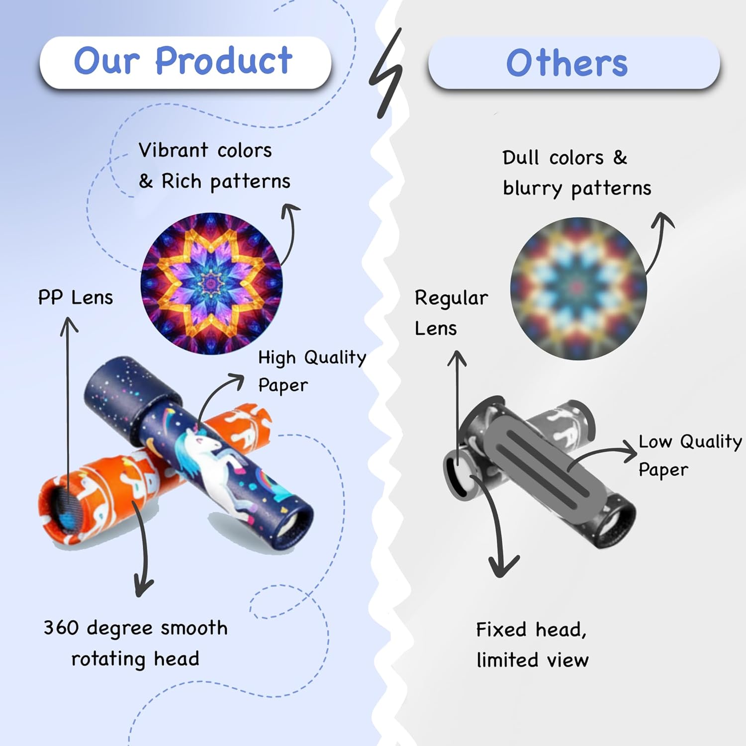 Dynamic Patterns: Twisting the front end or body of the kaleidoscope causes the loose, colored pieces inside to shift, resulting in an infinite variety of vibrant, intricate, and ever-changing mosaic designs.