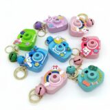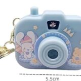 The image displays mini camera keychain toys. Some versions function as light projectors, casting colorful patterns. They often come with a wrist strap or key ring attachment for portability. Prices vary depending on functionality, ranging from simple toys to functional electronic devices.