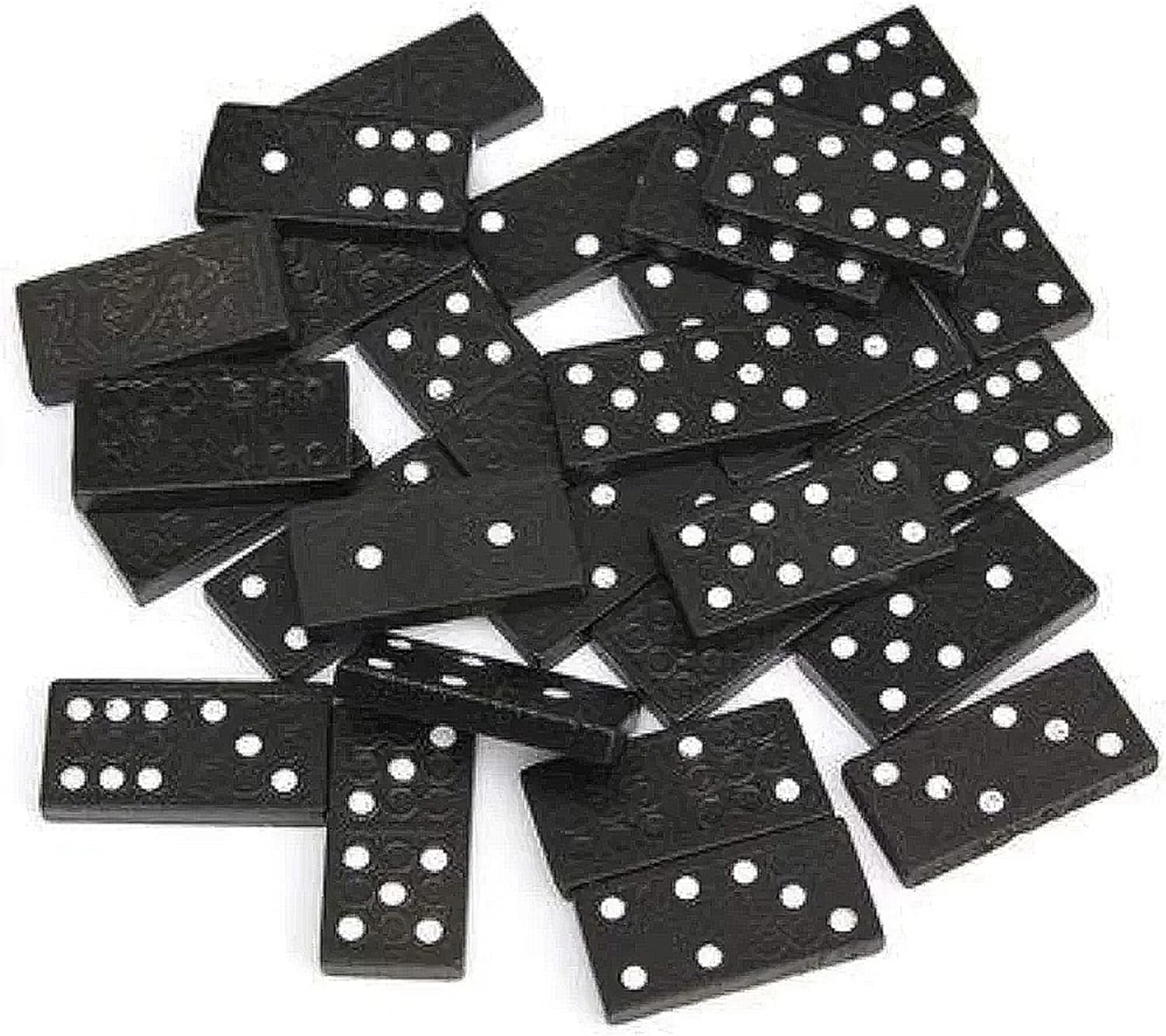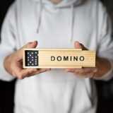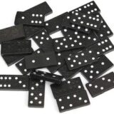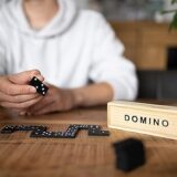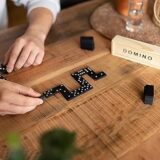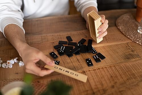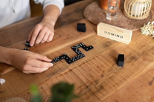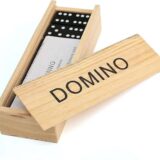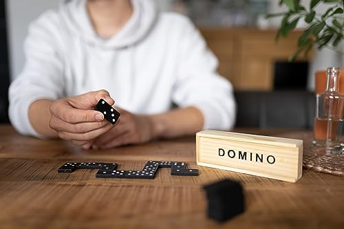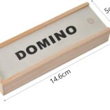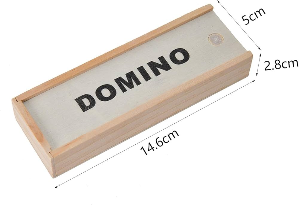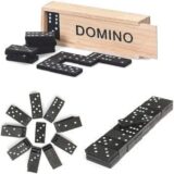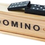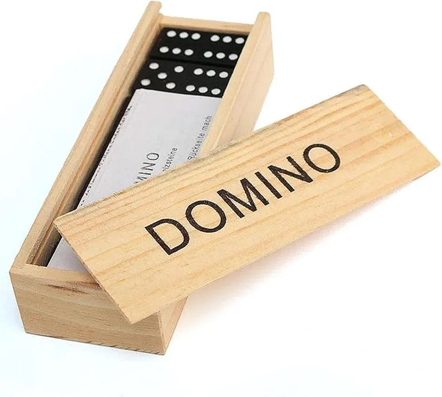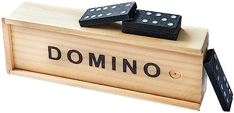 Traditional dominoes, often a double-six set with 28 tiles. Material: The tiles and box are made of wood. Design: The tiles feature classic black dots (pips) on a white background, while the box has the word "DOMINO" printed in black capital letters. Features: It is a durable and portable game set, suitable for both kids and adults and useful for travel or family game nights. Typical Price Range: Similar sets can be found for approximately 300 to 2,300 INR online, depending on the retailer and specific design.