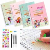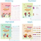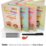The image displays a set of Sank Magic Practice Copybooks for children, which are reusable educational tools. The set includes four copybooks focusing on Math, Drawing, Numbers, and the Alphabet. A “magic” ink pen is included, whose ink automatically fades and disappears within about 30 minutes, allowing the books to be reused multiple times for practice. The paper is thick and durable, suitable for repeated use. A pen grip is also provided to help children develop proper writing form.