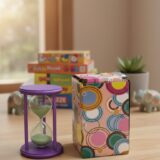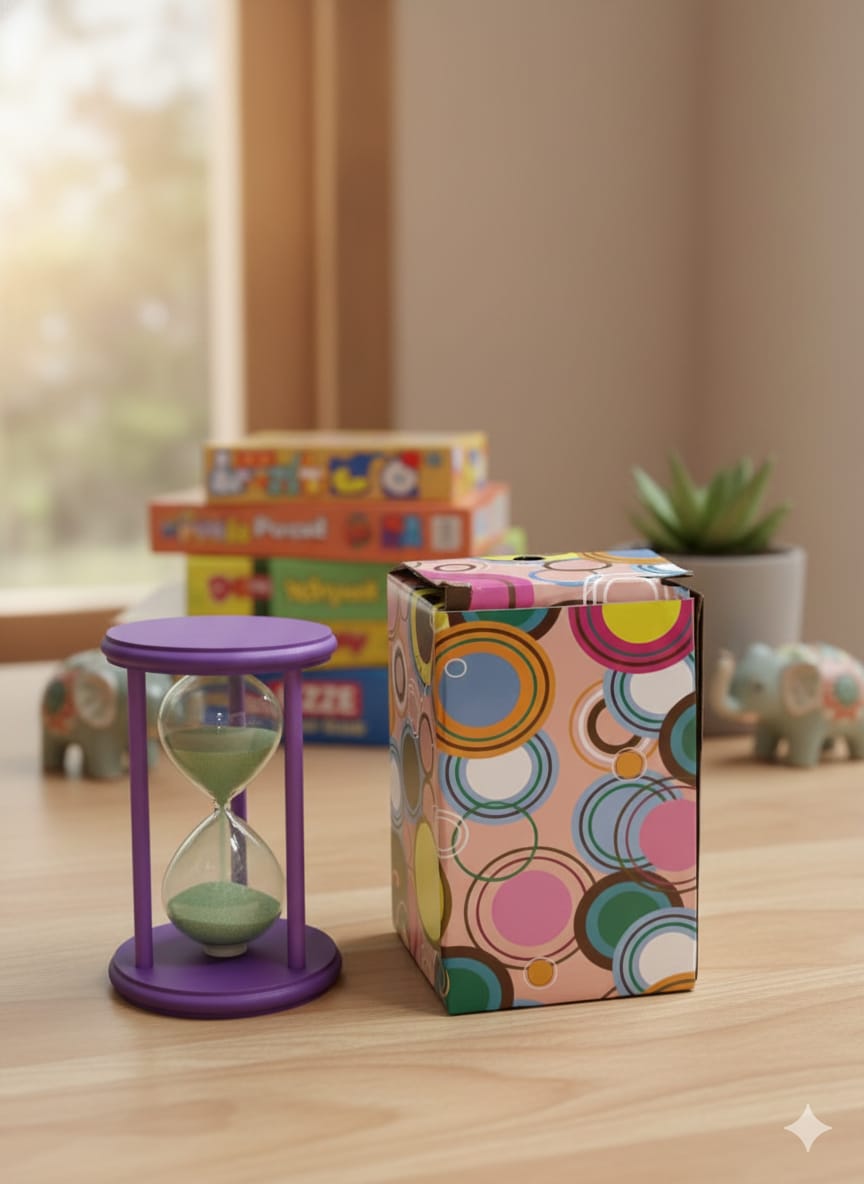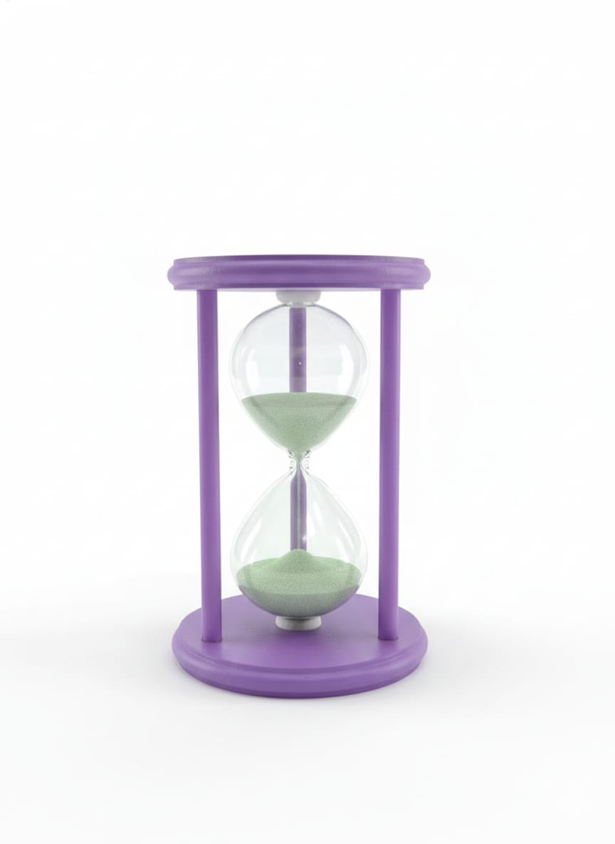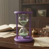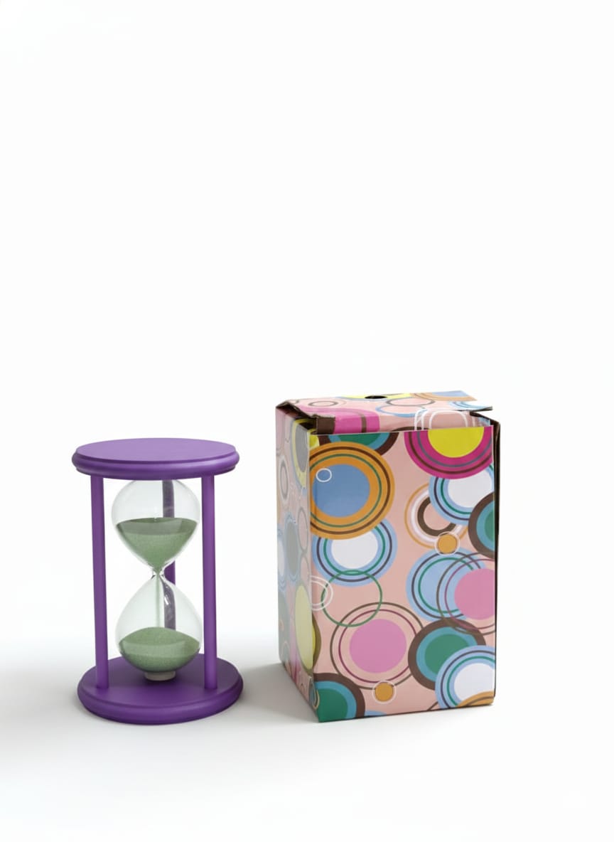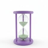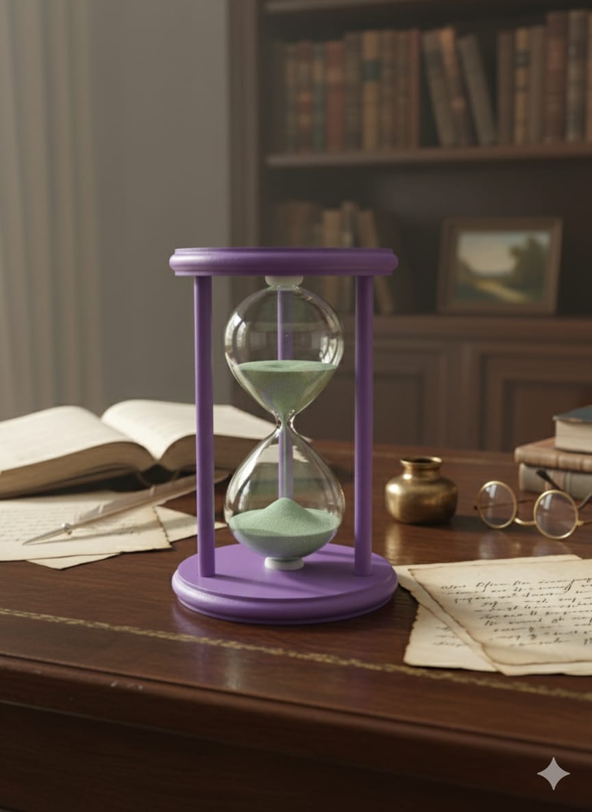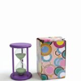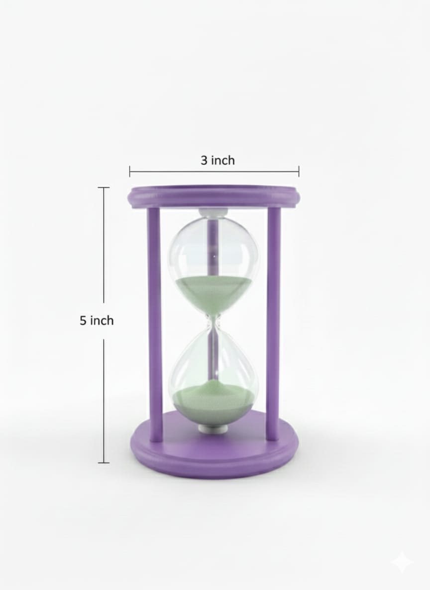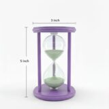 The image displays a modern hourglass, also known as a sand timer or sand clock, featuring a transparent glass body encased within a purple plastic frame. The frame has rounded top and bottom bases connected by four vertical supports. Inside the glass, fine, bright greenish-yellow (or white/violet) sand is shown collected in the bottom bulb, indicating the timer is in use or has just finished its cycle. The object appears to be a decorative or functional item used for measuring a specific duration of time.