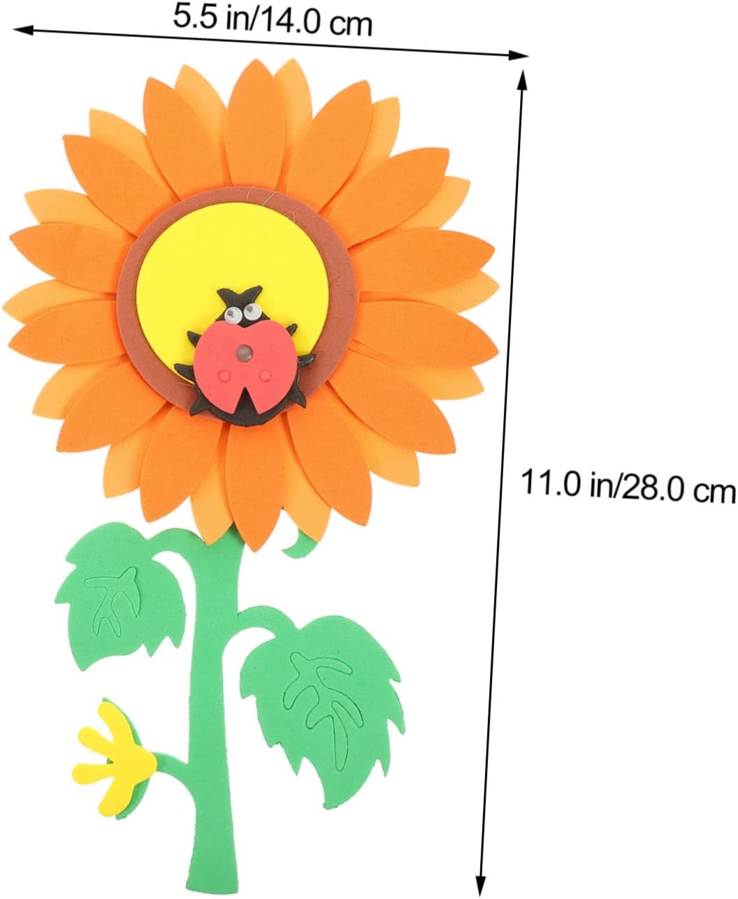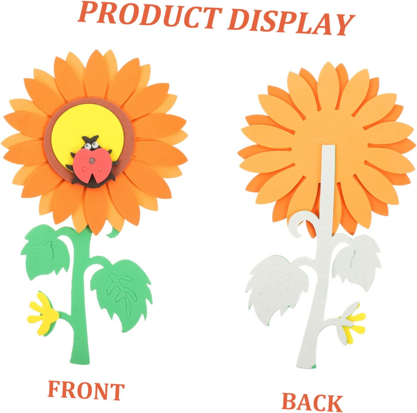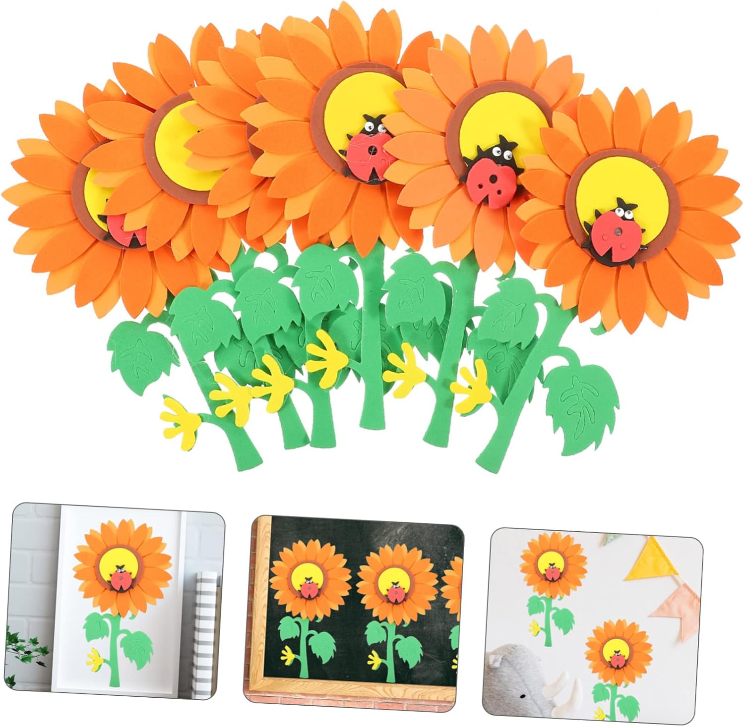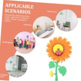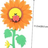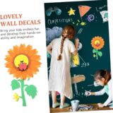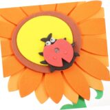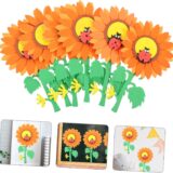 The image displays a digital design or tutorial for creating a paper sunflower craft. The images show steps for assembling paper cutouts to form a sunflower and accompanying leaves. The project uses paper cutouts to build a large sunflower with a distinct center and petals. The tutorial appears to be for a simple, handmade craft project, likely aimed at children or DIY enthusiasts. The final product is a decorative item that can add a cheerful touch to a room or serve as a school project.