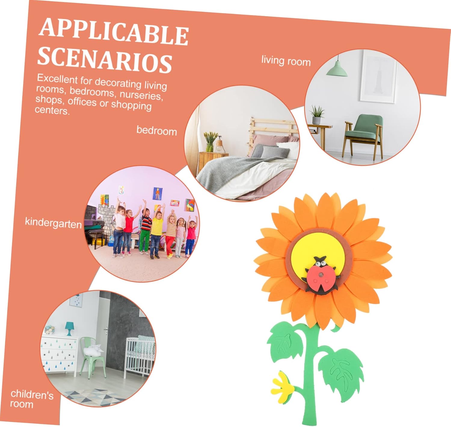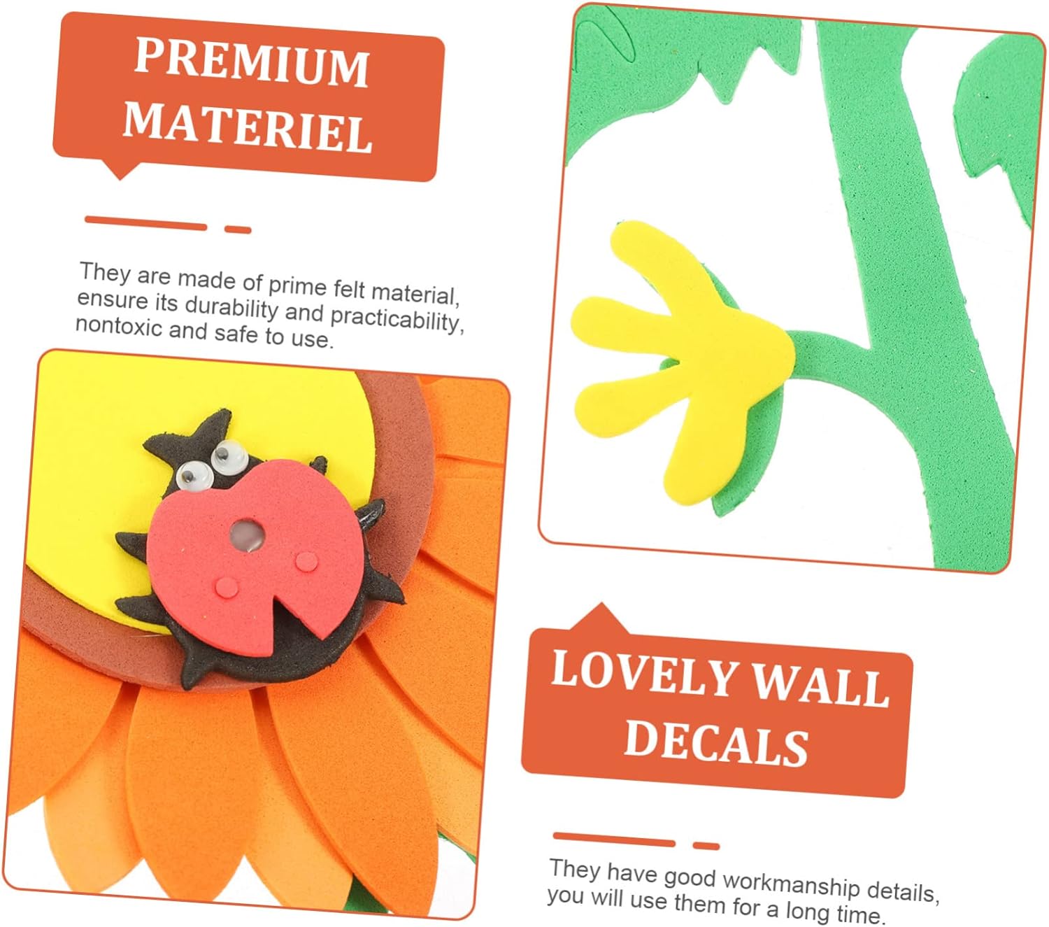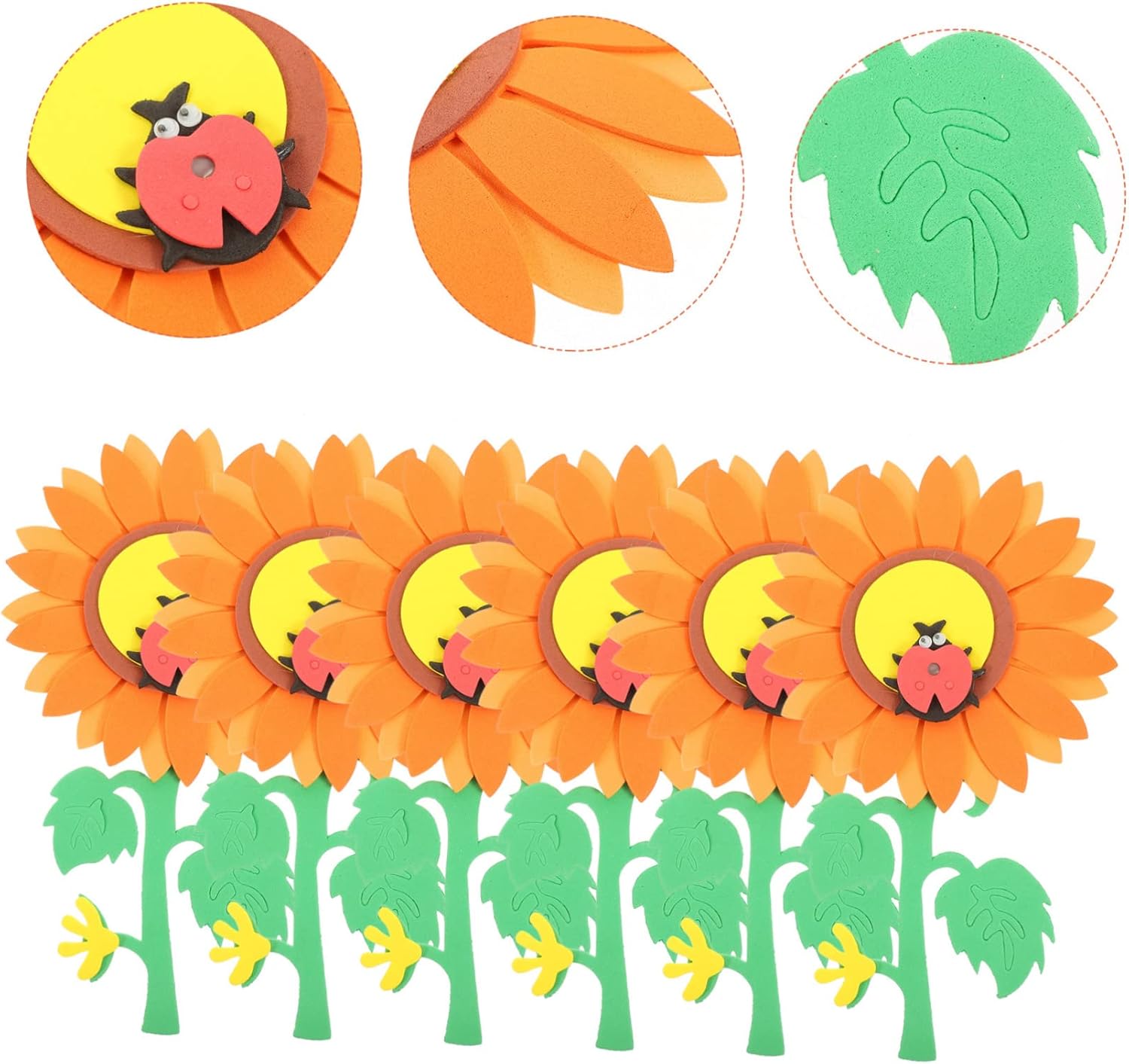 The image displays a digital design or tutorial for creating a paper sunflower craft. The images show steps for assembling paper cutouts to form a sunflower and accompanying leaves. The project uses paper cutouts to build a large sunflower with a distinct center and petals. The tutorial appears to be for a simple, handmade craft project, likely aimed at children or DIY enthusiasts. The final product is a decorative item that can add a cheerful touch to a room or serve as a school project.