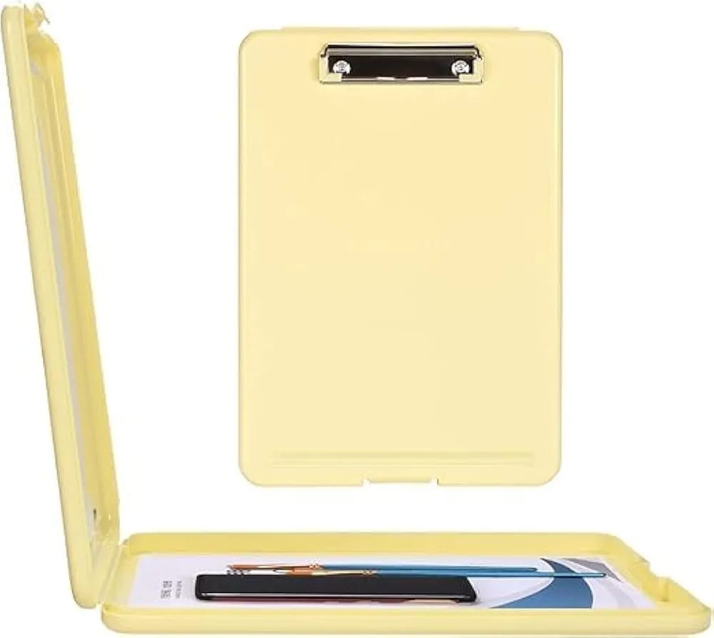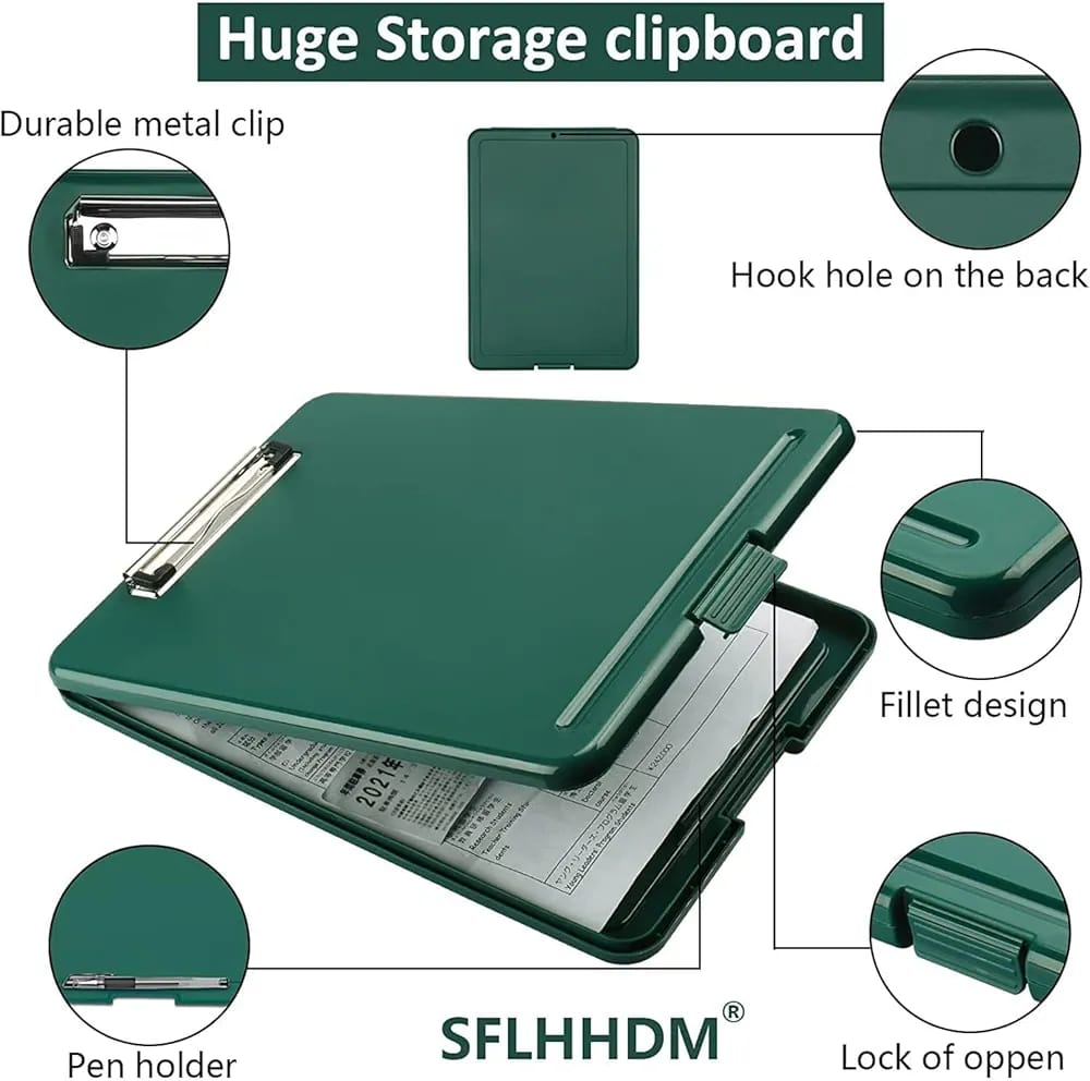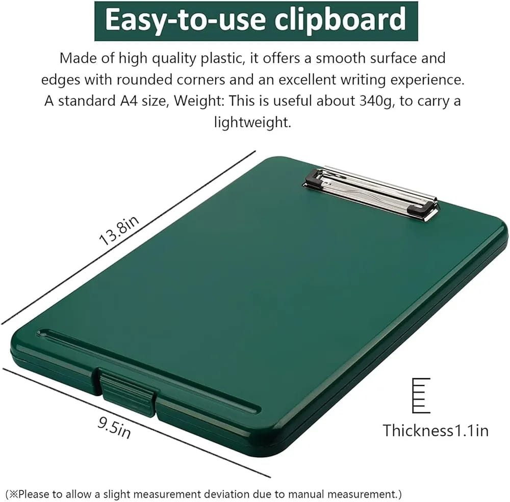 Material: Made with high-quality, durable plastic or polypropylene. Design: A traditional style clipboard with an extra storage compartment. Storage: A 3/4" storage compartment designed to secure a pad of paper, documents, writing instruments, and other small materials. Writing Surface: Provides a smooth and durable writing surface. Clip: Features a sturdy metal or premium low-profile clip to keep papers in place. Portability: Lightweight and easy to carry, making them portable for school, college, office, or home use. Size: Designed to fit A4 size sheets or standard exam papers. Functionality: Ideal for record-keeping, exams, drawing, and general use.