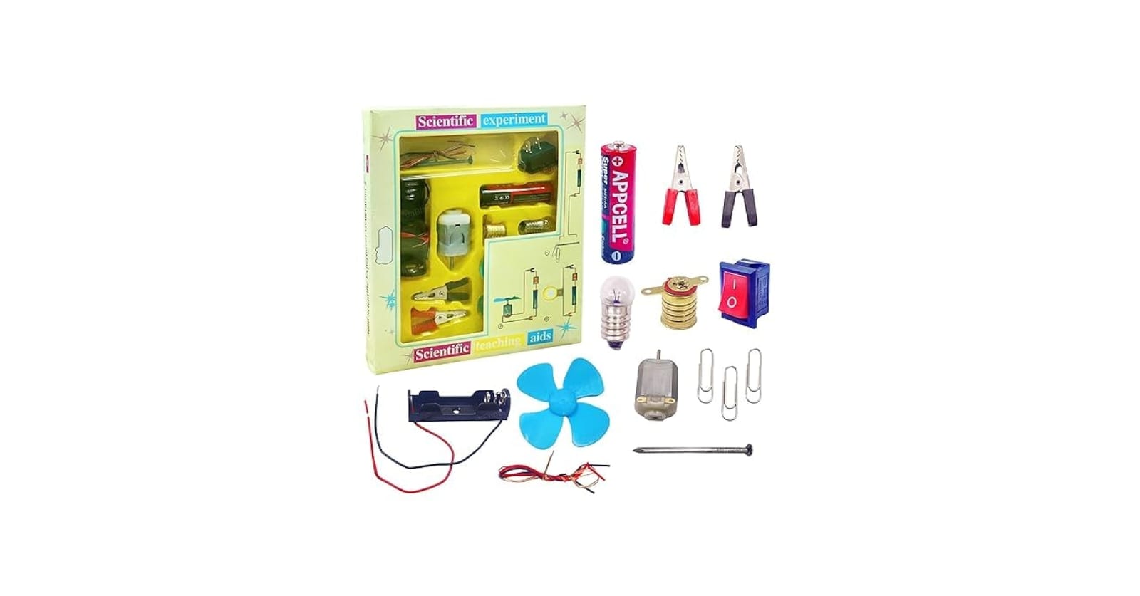 The kit includes components such as a motor, fan blade, light bulb, battery holder, alligator clips, and wires. It is marketed as an educational STEM (Science, Technology, Engineering, and Mathematics) learning toy.