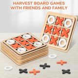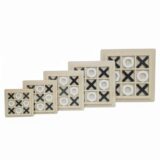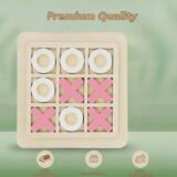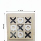 This is a classic strategy game, also known as noughts and crosses or Xs and Os, suitable for all ages. The specific board in the image is crafted from wood, featuring a grid with contrasting black X’s and white O’s playing pieces.