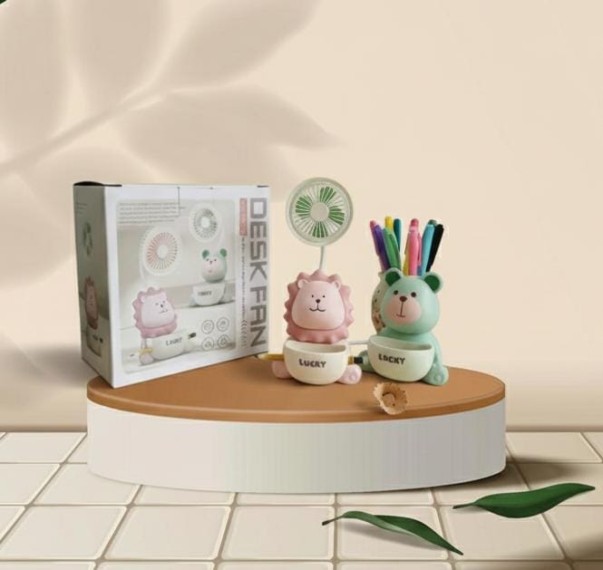 It combines a fan, sharpener, and pen stand, making it a versatile desk accessory.