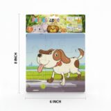 The image displays a completed children’s jigsaw puzzle featuring a cartoon dog with brown and white fur, a red collar, and its tongue hanging out. The puzzle has a simple background of a blue sky and green ground. The puzzle box is visible above the assembled puzzle, showing the brand name “Puzzles Zone” and indicating it is suitable for ages “4+”.