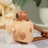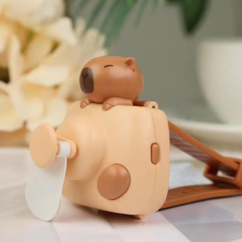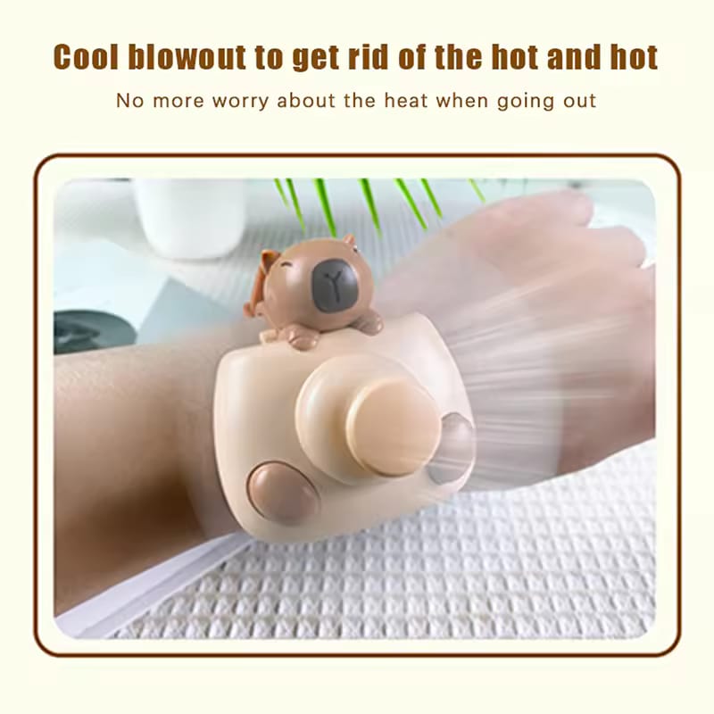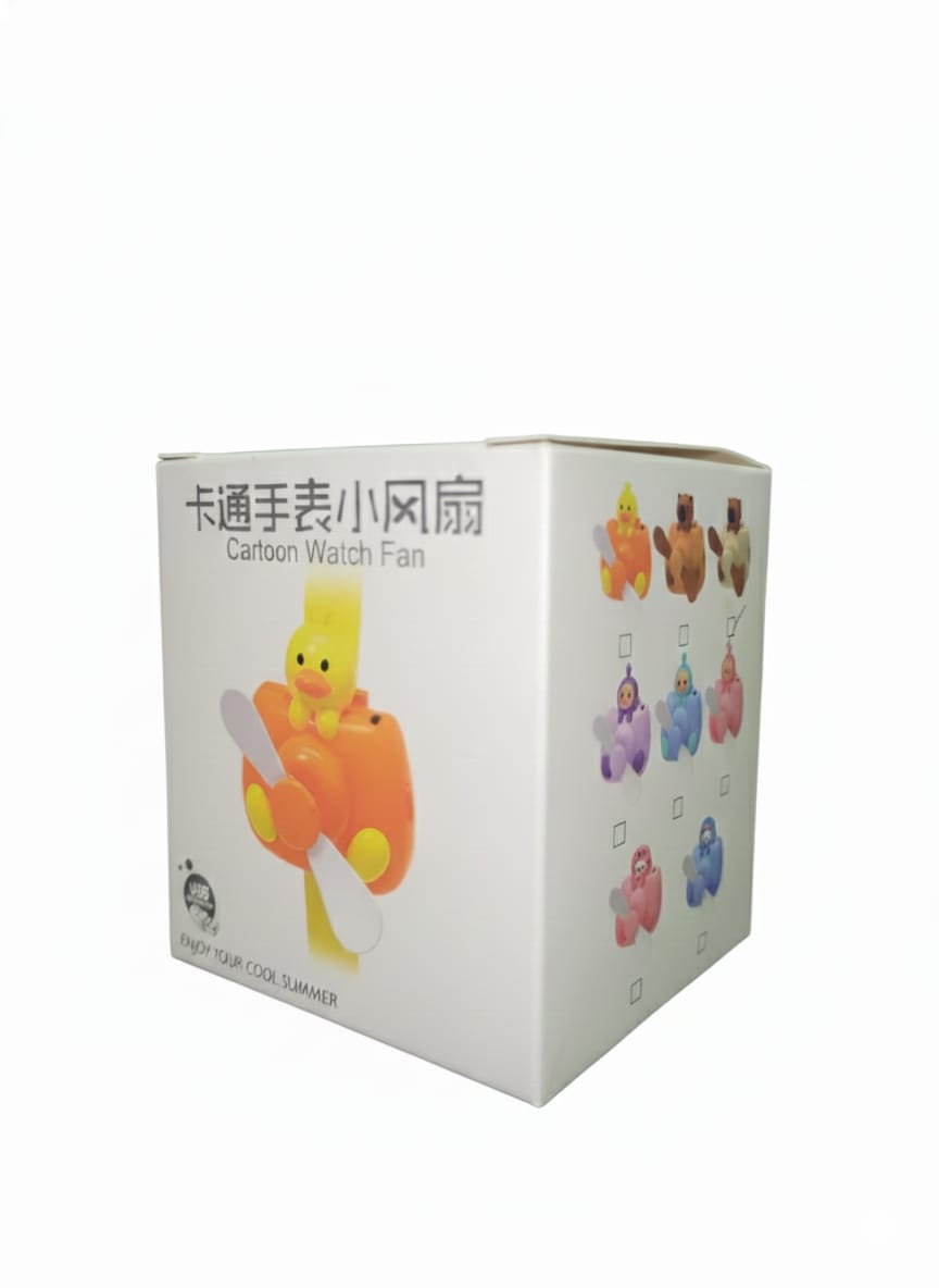 This is a portable, cartoon-themed, USB-powered watch fan featuring a yellow duck design. It is designed to be worn on the wrist or can stand on a desktop. The fan uses a USB interface for power supply and charging. It is described as a mini, lightweight, and portable device for personal cooling. The product is marketed for enjoying cool weather during the summer.