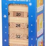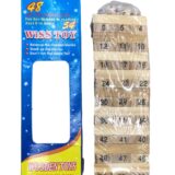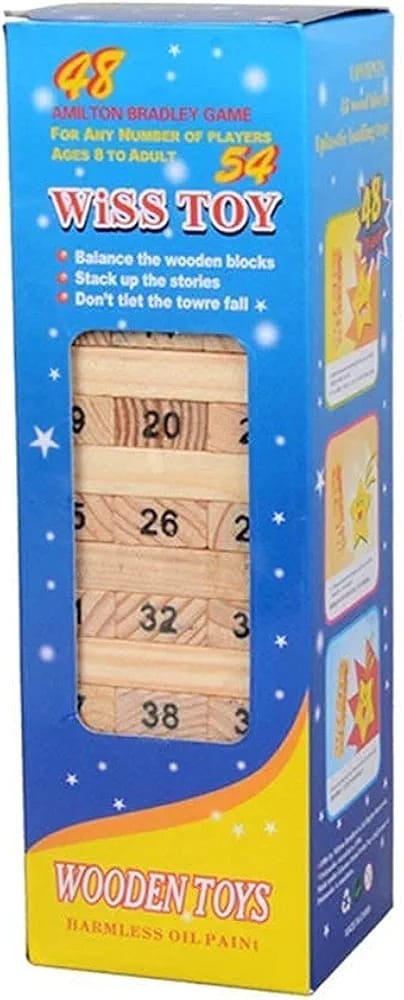 The product shown is a “WISS TOY” wooden block stacking game, similar to Jenga, which includes 54 high-quality, non-toxic wooden blocks with numbers printed on them. The objective of the game is for players to take turns removing blocks from the tower and stacking them on top without causing the tower to fall. It is designed for any number of players, suitable for ages 6 to adult, and can help improve patience, self-control, and hand-eye coordination, and can even be used to teach basic addition or math skills when incorporating dice into the gameplay. The blocks have smooth edges and surfaces, making them safe for all players.