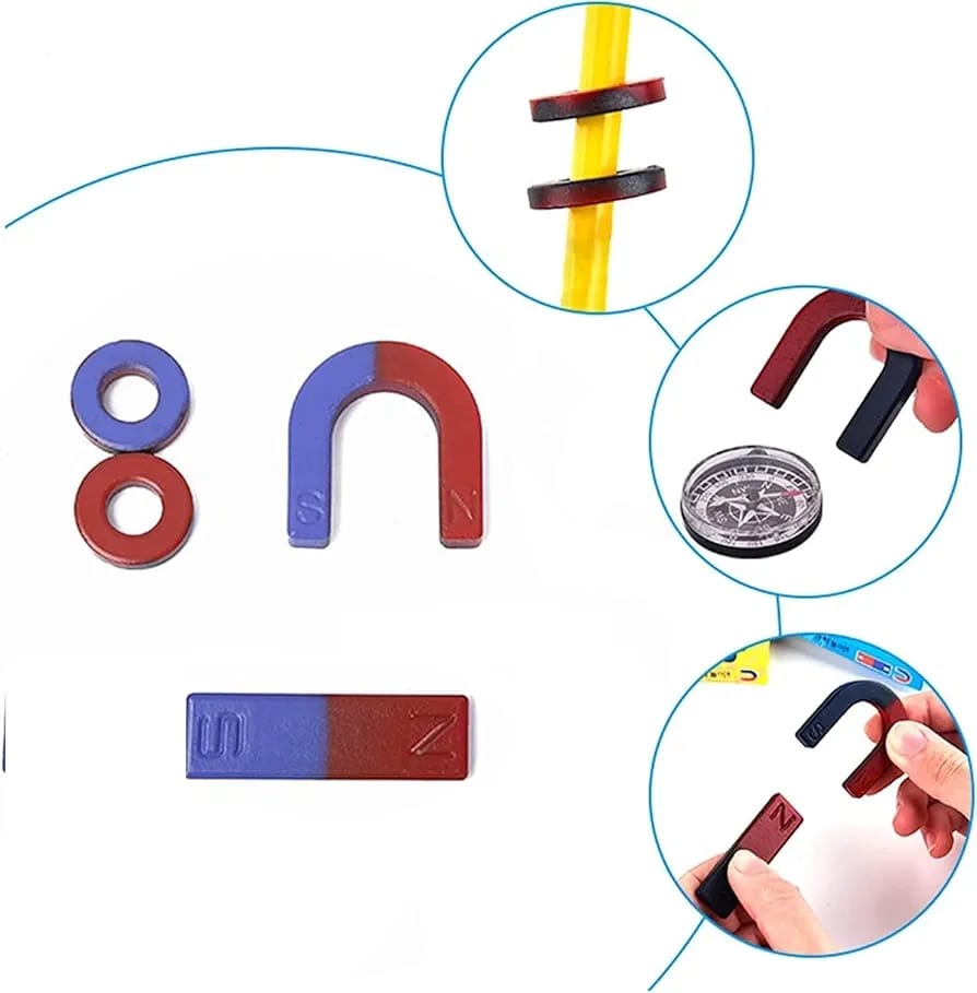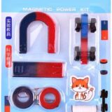 The image displays a “Magnetic Power Kit,” an educational science set designed for children to learn basic physics principles and explore magnetism through hands-on experiments. This comprehensive starter kit typically includes several types of magnets and accessories for various activities. Key components visible in the package are a large U-shaped (horseshoe) magnet, a rectangular bar magnet, two ring magnets, small cylindrical magnets, a simple car with magnets for demonstrating principles like magnetic levitation, and a small cat sticker. The set allows students to intuitively feel the existence of a magnetic field and understand concepts such as magnetic poles and attraction/repulsion.