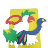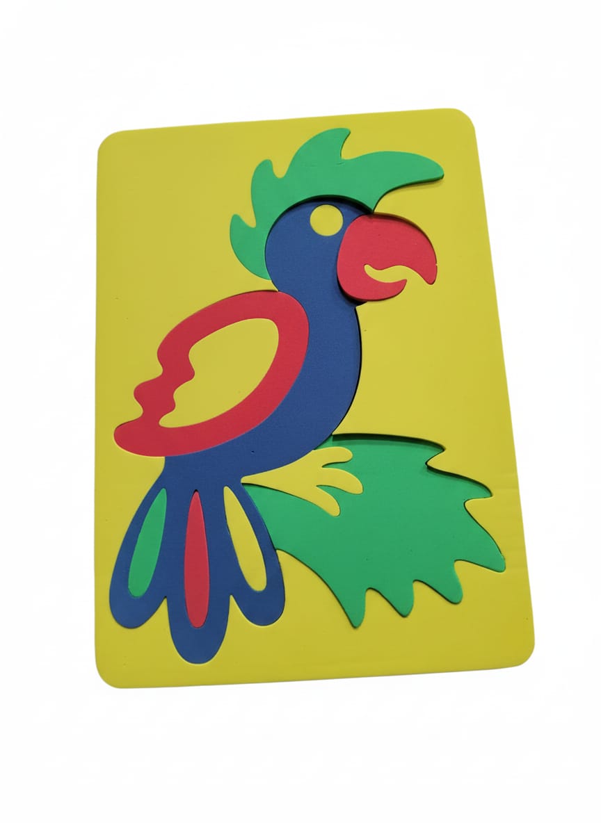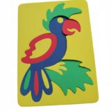 Consists of multiple colorful pieces, often geometric in shape, that fit together to form the image of a parrot.