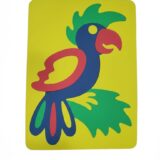 The parrot image features prominent colors of blue, red, yellow, and green on a yellow background. The surrounding interface indicates the graphic is being edited or prepared for a product
