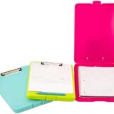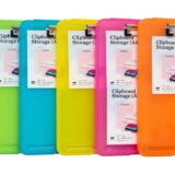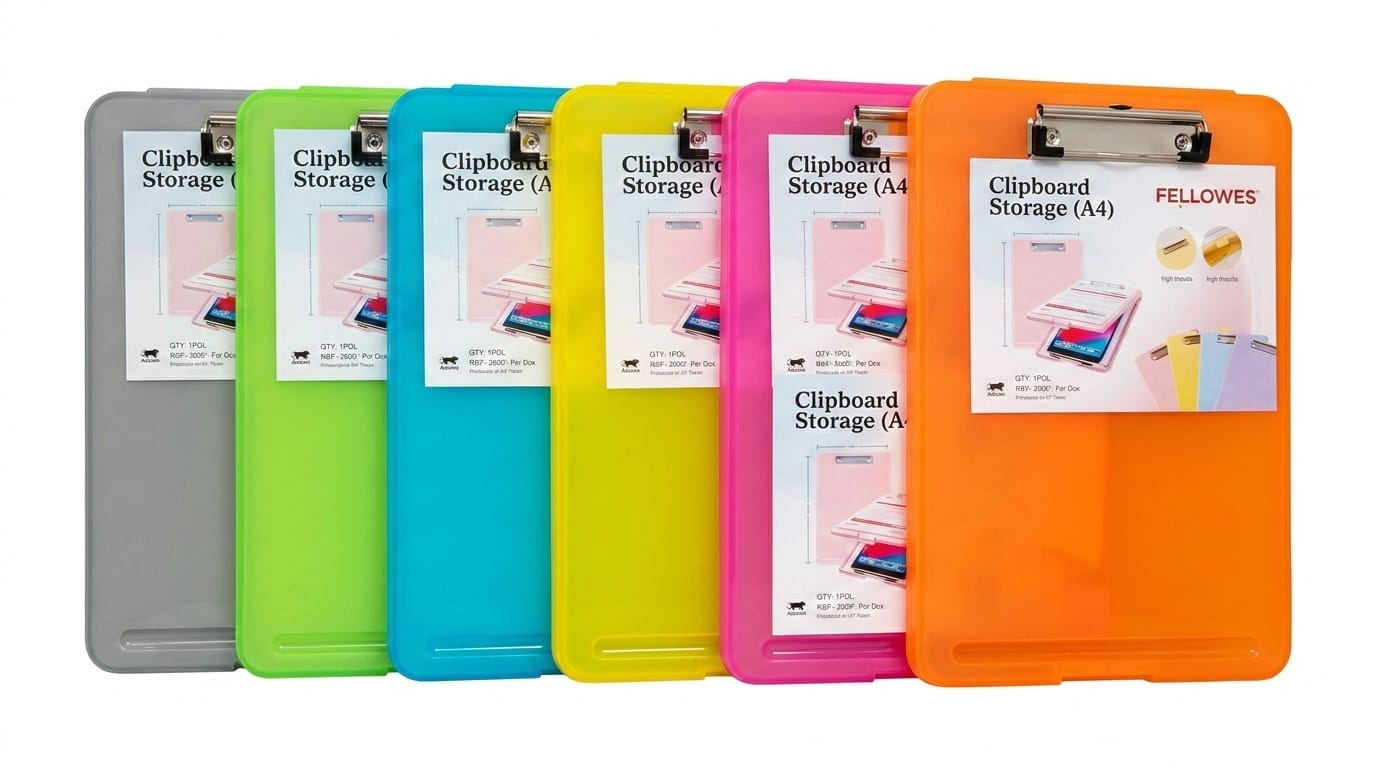 The image displays a light blue Fellowship brand A4-sized storage clipboard, which is a two-in-one solution combining a sturdy writing surface with a storage case. This high-quality, durable item is designed with ample internal storage space for papers, forms, and notepads, capable of holding up to 70 A4 sheets. Engineered from high-quality plastic or polypropylene, the clipboard is waterproof and features a low-profile stainless steel clip. The product, which has an MRP of ₹599/-, is also available in various other colors such as pink, yellow, and purple.
