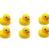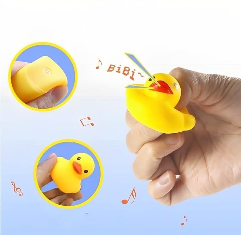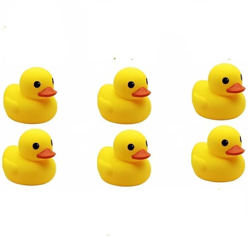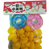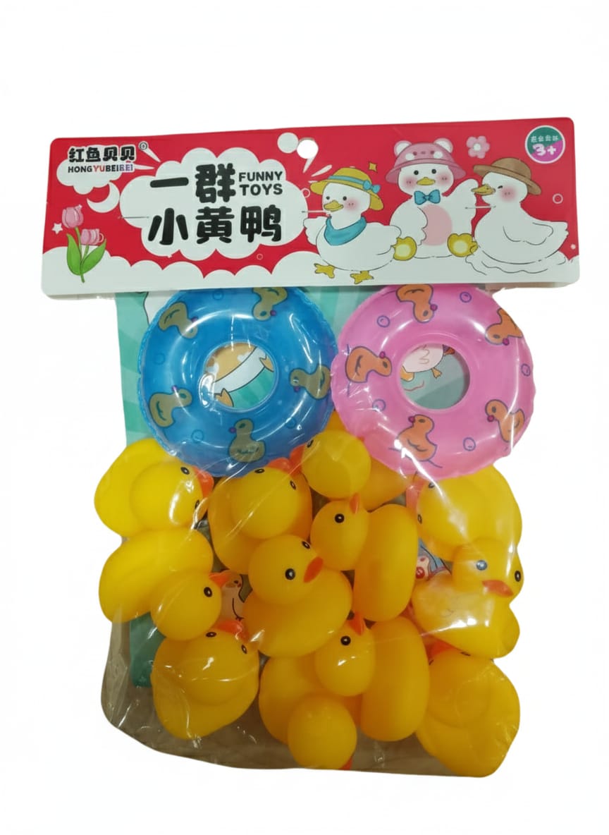 The image displays a clear plastic package containing a collection of small, yellow rubber ducks and two miniature, inflatable swimming rings, one in blue and one in purple. These items are typically marketed as baby bath toys, designed for water play in bathtubs or pools. The ducks are often made from soft, non-toxic rubber or PVC and may feature a squeeze-sound mechanism. The miniature swimming rings are also made of durable PVC material.