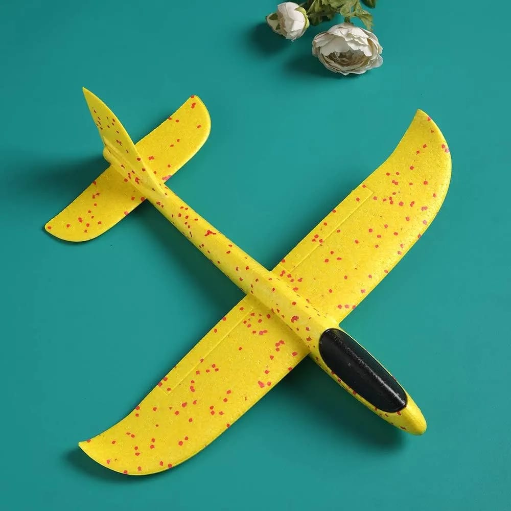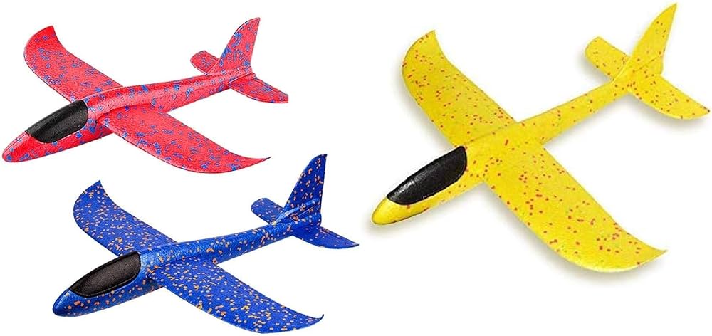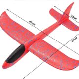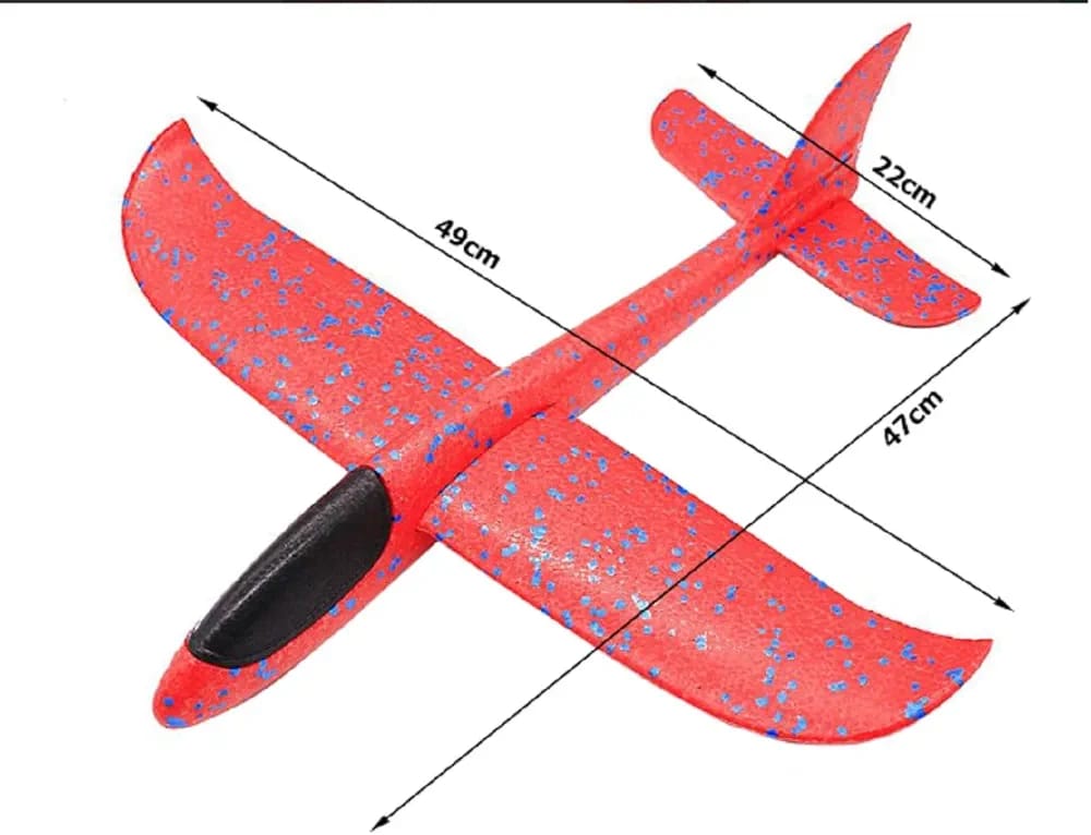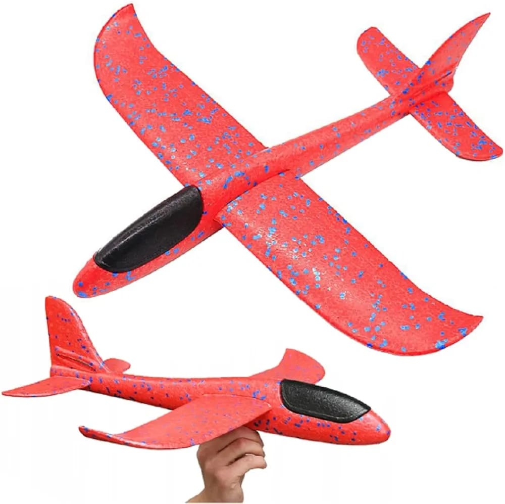 The image features a large, hand-throwing foam glider airplane toy, often sold in packs with assorted colors like red and blue. These toys are made from durable EPP high-polymer foam material, designed to withstand crashes during outdoor play. They are easy to assemble, typically by sliding the wings and tail fin into designated slots. Some versions offer a flight upgrade with two tail position options to switch between loop flight and level flight patterns.