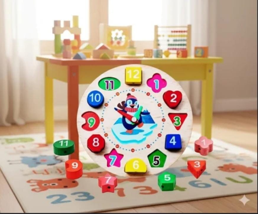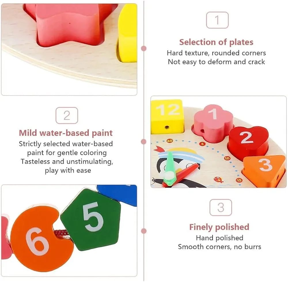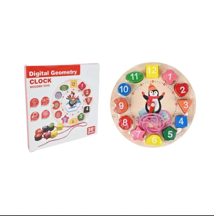 This is a “Digital Geometry Clock Wooden Toys” which is a type of shape-sorting clock for children. These educational toys are designed to help young children learn about telling time, shapes, numbers, and colors. It is often made from wood and uses non-toxic, child-safe paints. The toy helps develop fine motor skills and hand-eye coordination. Some versions also include a bead lace for stringing the number pieces.