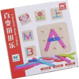 The image displays a “Hundred Change puzzle” wooden educational board game for children. This toy is designed to help children develop problem-solving skills, hand-eye coordination, and creative thinking.  The set features 100 different patterns that can be rearranged, offering a variety of creative play opportunities. It is typically recommended for children aged 36 months and older.