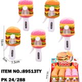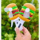 The image displays a small, handheld, manual mini fan designed in the shape of a hamburger. The fan features layers of “buns,” “meat,” “cheese,” and “vegetables” that give it a realistic fast-food appearance. It has a white handle extending from the bottom “bun,” with the words “Mini Fan” printed vertically on it. This type of fan is typically a manual, hand-press toy designed for children, known for being compact and lightweight, making it portable for outdoor use. It operates without batteries, relying on a hand mechanism to generate a breeze.