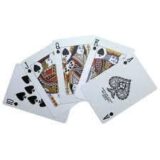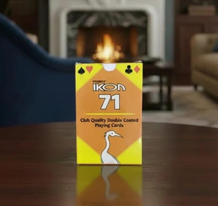 The product shown is a deck of Promiss Ikon 71 playing cards. They are described as having club quality and being double coated. The cards are made from a high-quality, plastic-coated paper material, which gives them a fresh, bright look and increases durability and smoothness. Each deck contains 52 playing cards, two jokers, and one extra joker. The brand is known for its unique crane design on the box and the cards are suitable for various games like Rummy, Poker, Teen Patti, and Bridge, as well as for performing magic tricks. The cards are manufactured in India.
