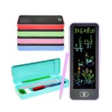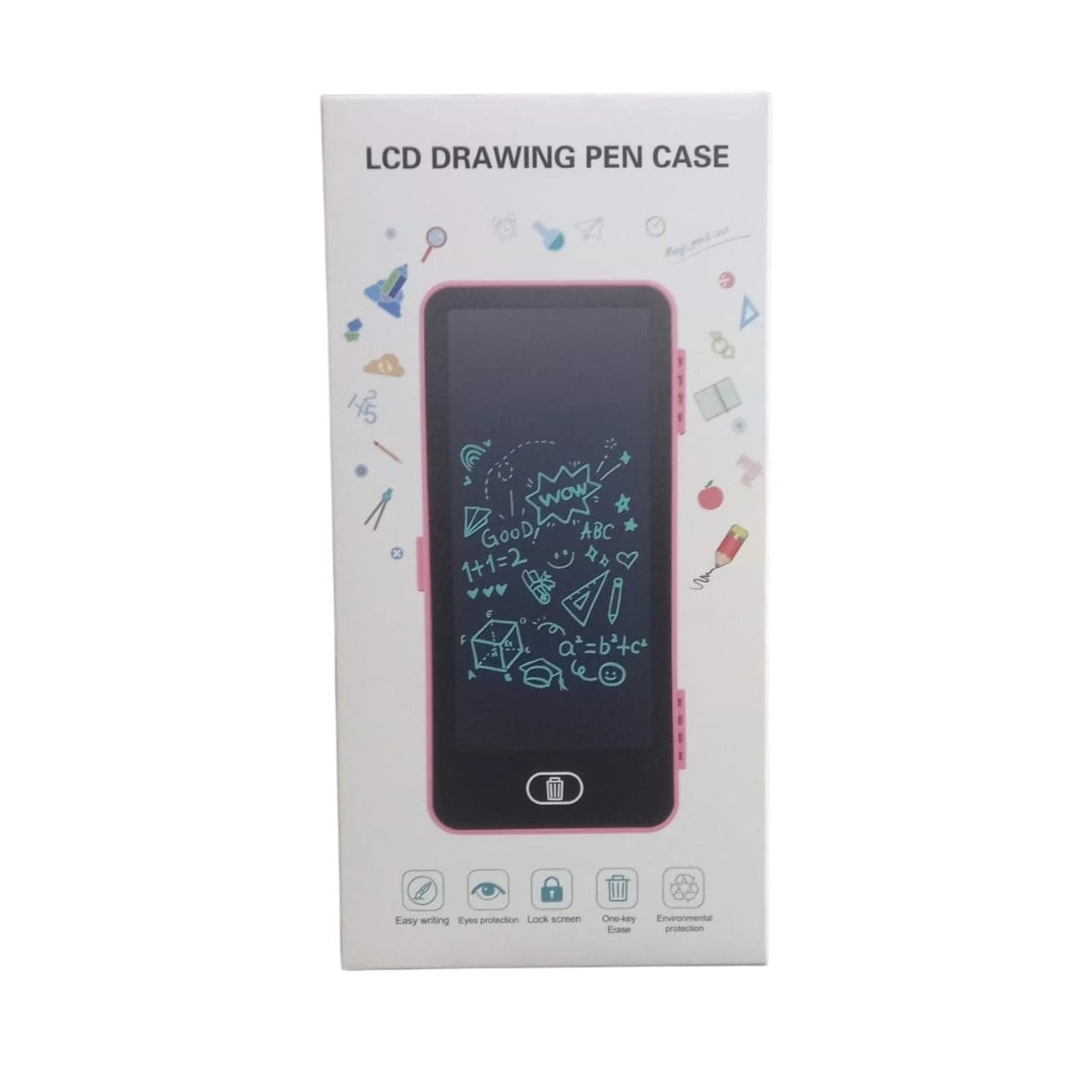 The image displays an innovative product that functions as a two-in-one pencil case and a built-in LCD writing screen. This smart stationery case is designed for children to draw, practice math problems, or take notes without wasting paper. The LCD screen is reusable and features a convenient one-touch erase button that instantly clears the screen, promoting eco-friendly habits. The case provides ample storage compartments for organizing various stationery items like pens, pencils, erasers, and rulers. Made from durable materials, this lightweight and portable item is ideal for use at school, home, or while traveling.