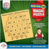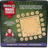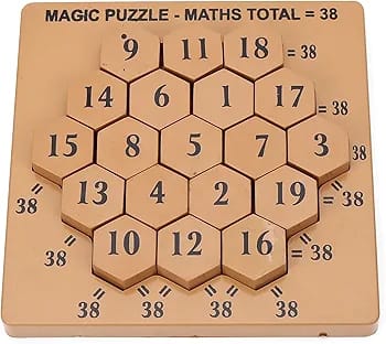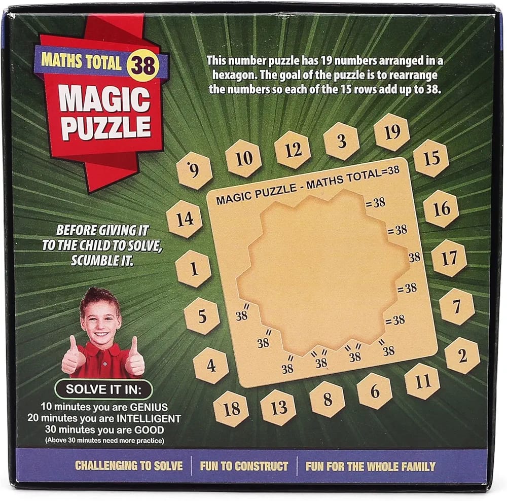 The image displays the packaging for a product named “Ratna’s Magic Puzzle – Maths Total 38,” an educational toy designed for ages 5 to 99 years. This puzzle challenges users to arrange numbered hexagonal pieces such that every horizontal, vertical, and diagonal line of numbers adds up to a total of 38. The box highlights educational objectives such as enhancing problem-solving skills, critical thinking, knowledge, hand-eye coordination, and imagination. It is described as a fun, challenging activity for the whole family, with suggested time limits for solving it (e.g., 10 minutes for a genius rating). The packaging also instructs users to scramble the pieces before giving it to a child to solve.