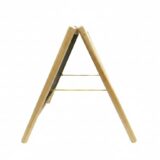 The image displays a small, portable whiteboard designed in an A-frame easel style, likely intended for children or personal use. The board surface is white and appears to be magnetic and dry-erasable. It is set within a light-colored wooden or wood-look frame, and has two dark feet or stoppers visible at the bottom. A small ledge runs along the bottom edge of the board, holding a green-capped dry-erase marker and a black eraser. Similar boards are often made from materials like plastic, metal, or coated wood and are described as durable and easy to carry.