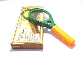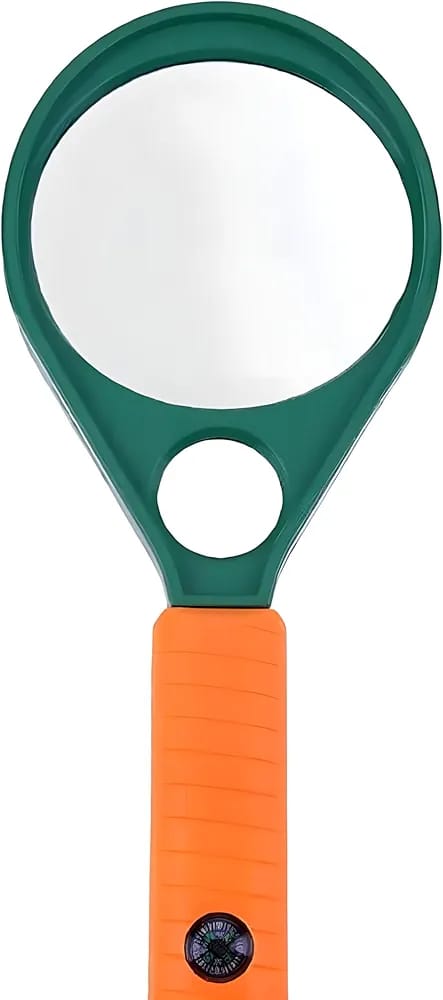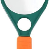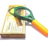 The product shown is a handheld magnifying glass, often referred to as a racket-type loupe. It features a green plastic frame and an orange or yellow handle made of ABS plastic. This specific model typically has a double lens with a diameter around 65mm to 90mm and offers dual magnification powers, commonly 4X and 6X, or sometimes 3X and 6X. It is a lightweight optical instrument, often used for reading small print, examining fine details, or as a teaching material in science classes.