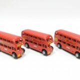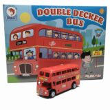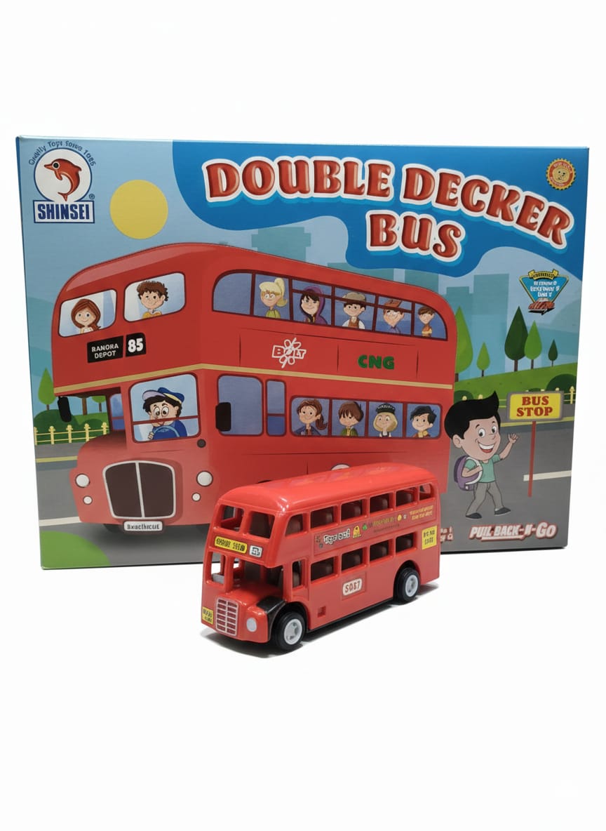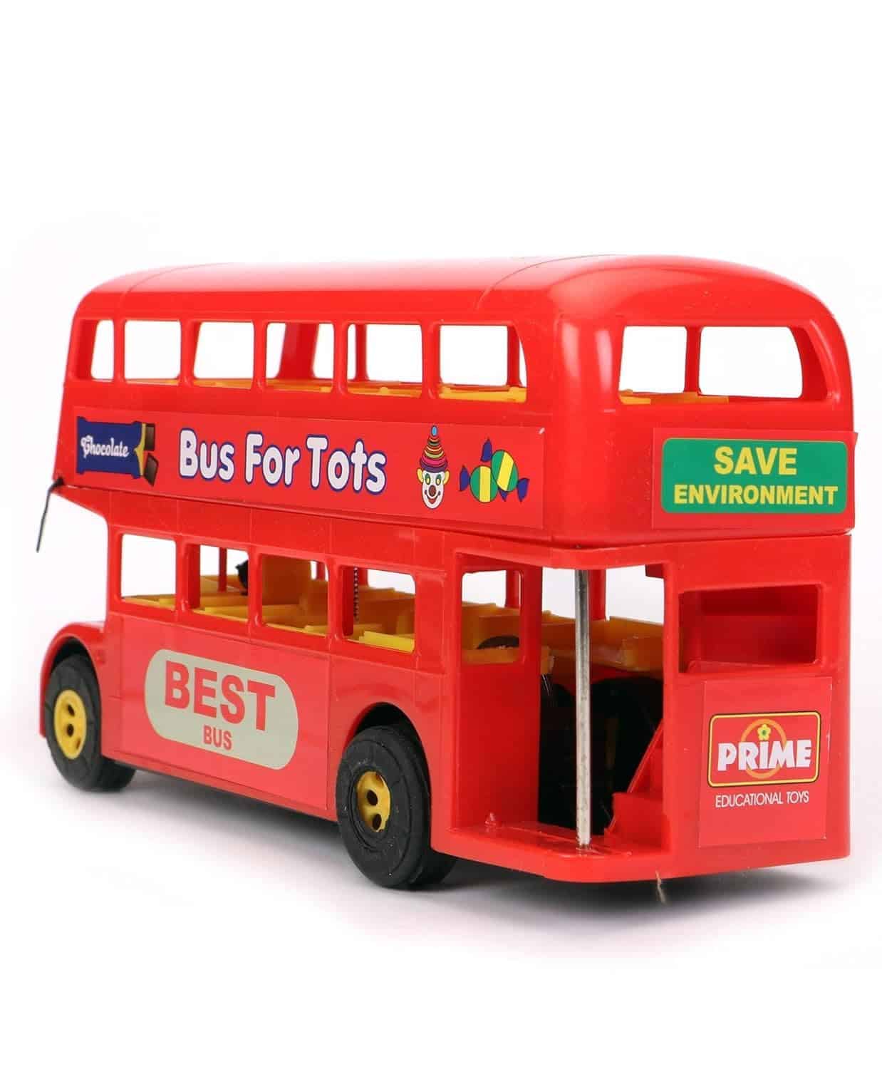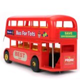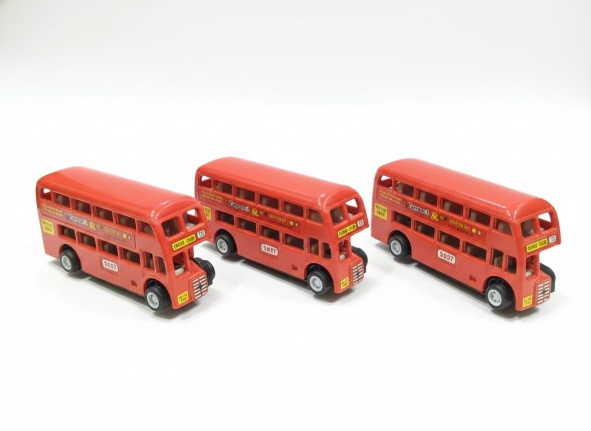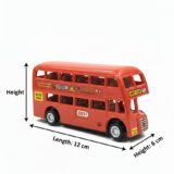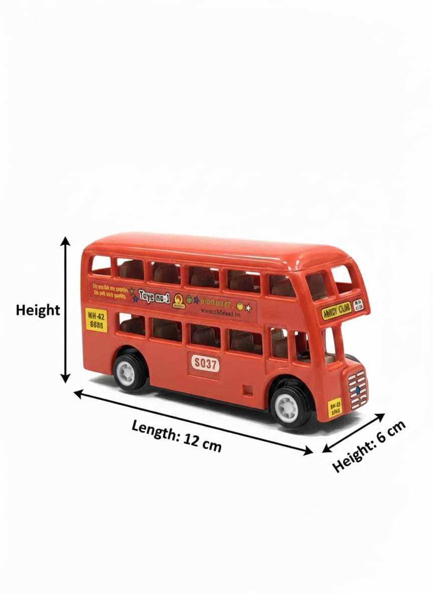 The image displays a red friction-powered toy double-decker bus. This is a miniature model of the famous Mumbai double-decker bus, featuring details like bus number and destination. The toy is friction-powered, meaning no batteries are required; simply push it to make it move. The toy is recommended for children aged 3 years and above and helps encourage imaginative play and motor skills development.
