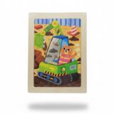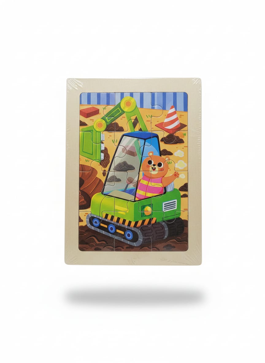 This is a wooden jigsaw puzzle featuring a cartoon illustration. The puzzle depicts a bear wearing a striped shirt operating a green excavator in a construction site setting with piles of dirt and a traffic cone. It appears to be a multi-piece puzzle designed for young children.