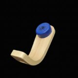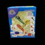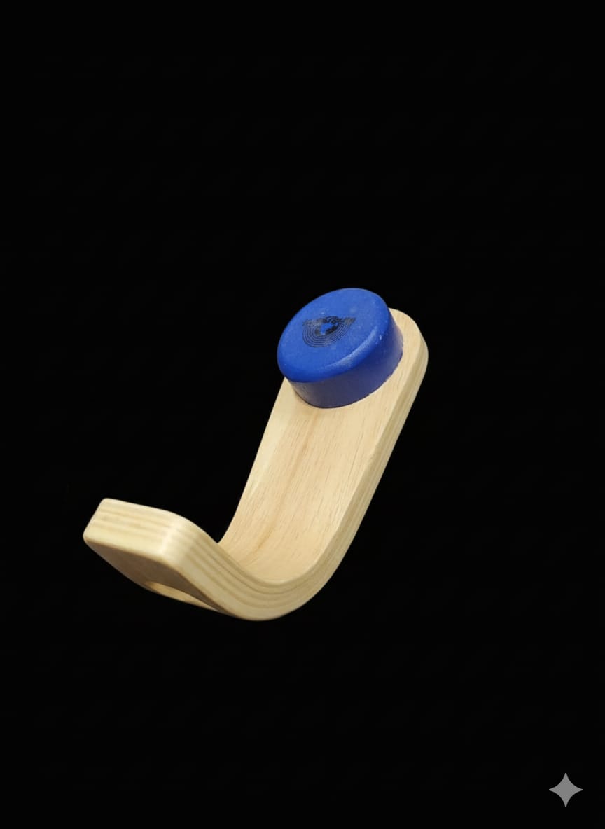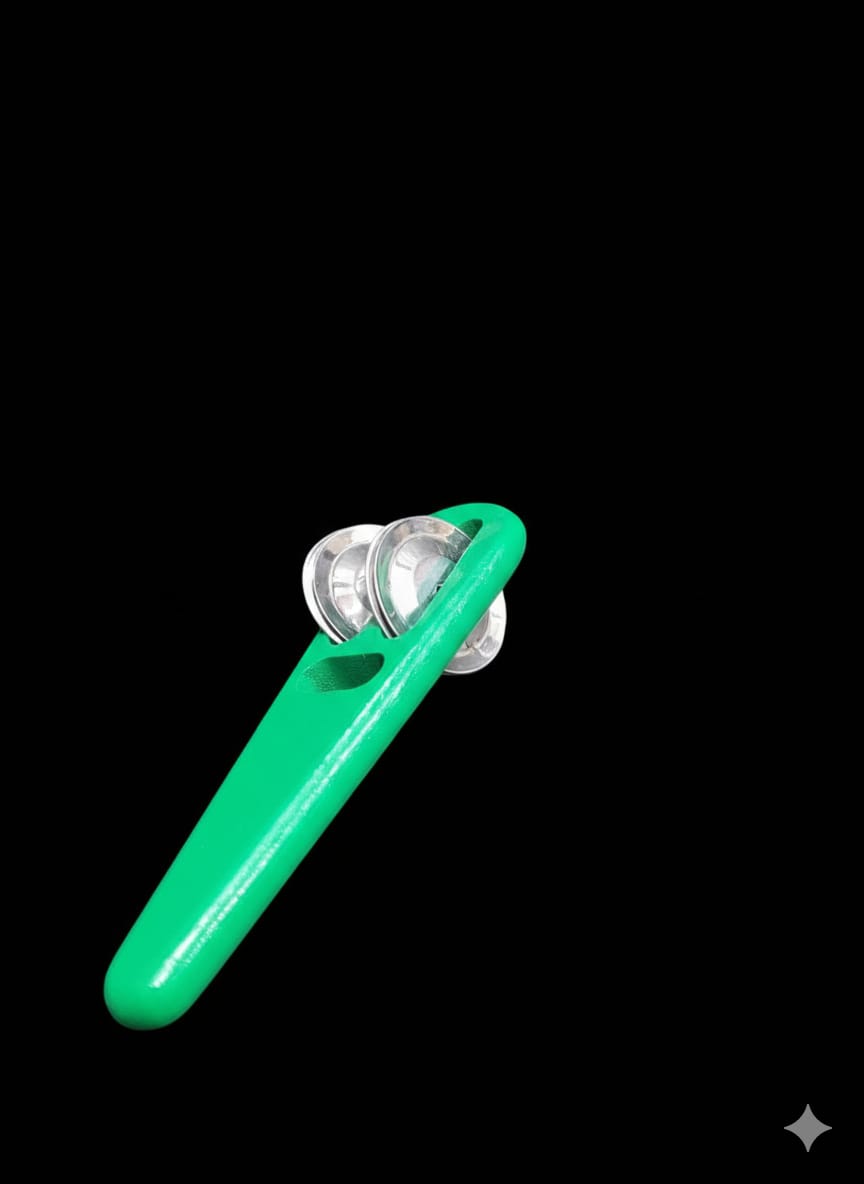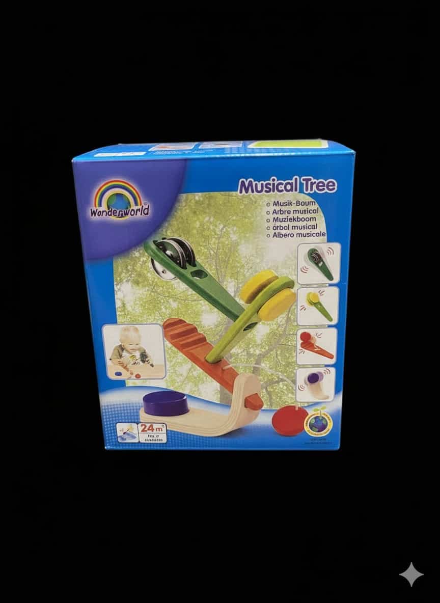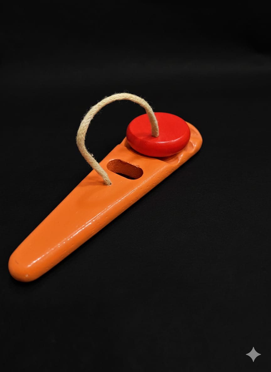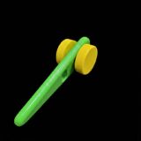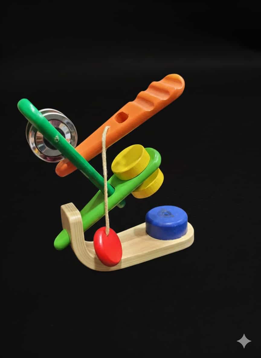 The image displays a colorful wooden musical instrument toy designed for young children. The toy is crafted from natural wood and features multiple components intended to produce various sounds, including a sounder, rattle, castanet, and cymbals. The base of the toy is light wood, supporting a blue cylindrical piece and a red oval clapper attached by a white string. A green cross-piece holds yellow and brown clappers (castanets) and small cymbals, encouraging children to explore rhythm and melody through interactive play.