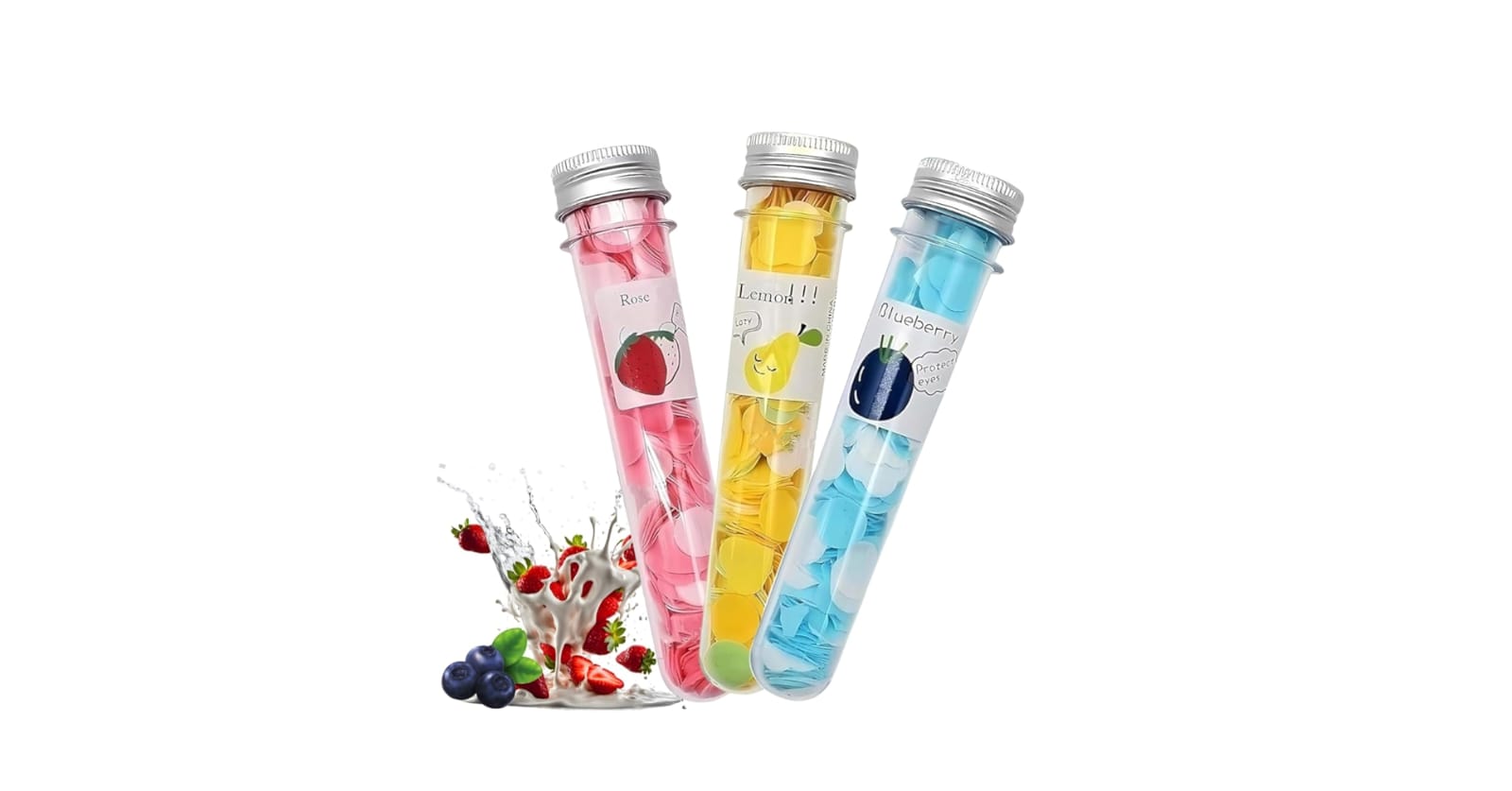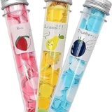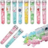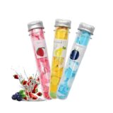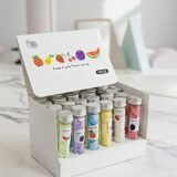 The image displays a box of portable paper soap flakes, part of a product line called “Fresh Fruits Power Series”. The product consists of several small, test-tube-shaped plastic containers with silver caps, arranged neatly inside an open white box. Each container appears to hold scented, water-soluble paper soap sheets designed for convenient hand washing on the go. The individual tubes feature colorful labels, with some visible fruit illustrations on the box lid, indicating assorted fruit fragrances. This product is marketed as a travel essential for maintaining hygiene when public soap is unavailable.