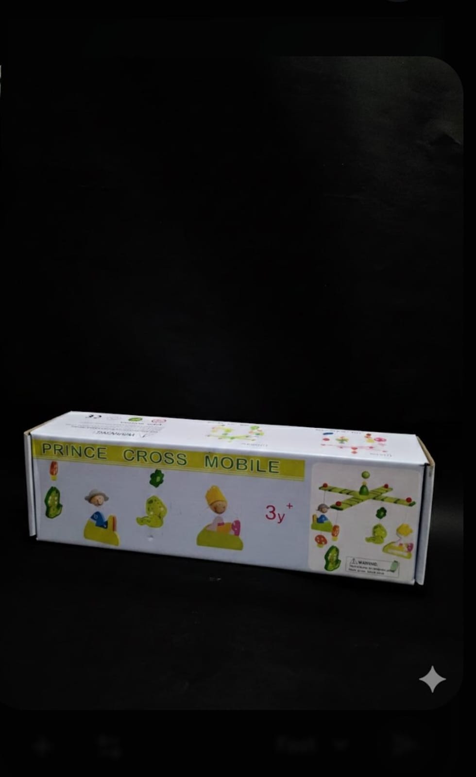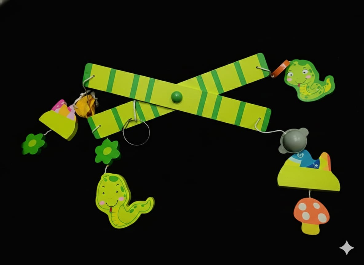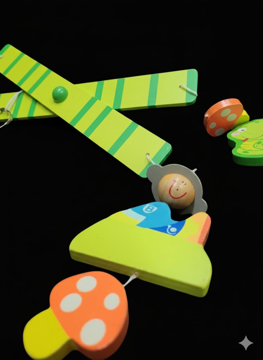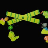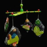The image displays a wooden baby crib mobile with a multi-colored design. It features a horizontal bar, painted yellow with green accents and small red knobs at the ends, suspended by a white string from a green, rounded top piece. The mobile has four strings hanging down, each with a toy attached at the bottom. The toys appear to be made of painted wood, possibly in the shape of animals or vehicles, and are individually wrapped in clear plastic packaging. The background is dark, and the mobile appears to be displayed indoors.