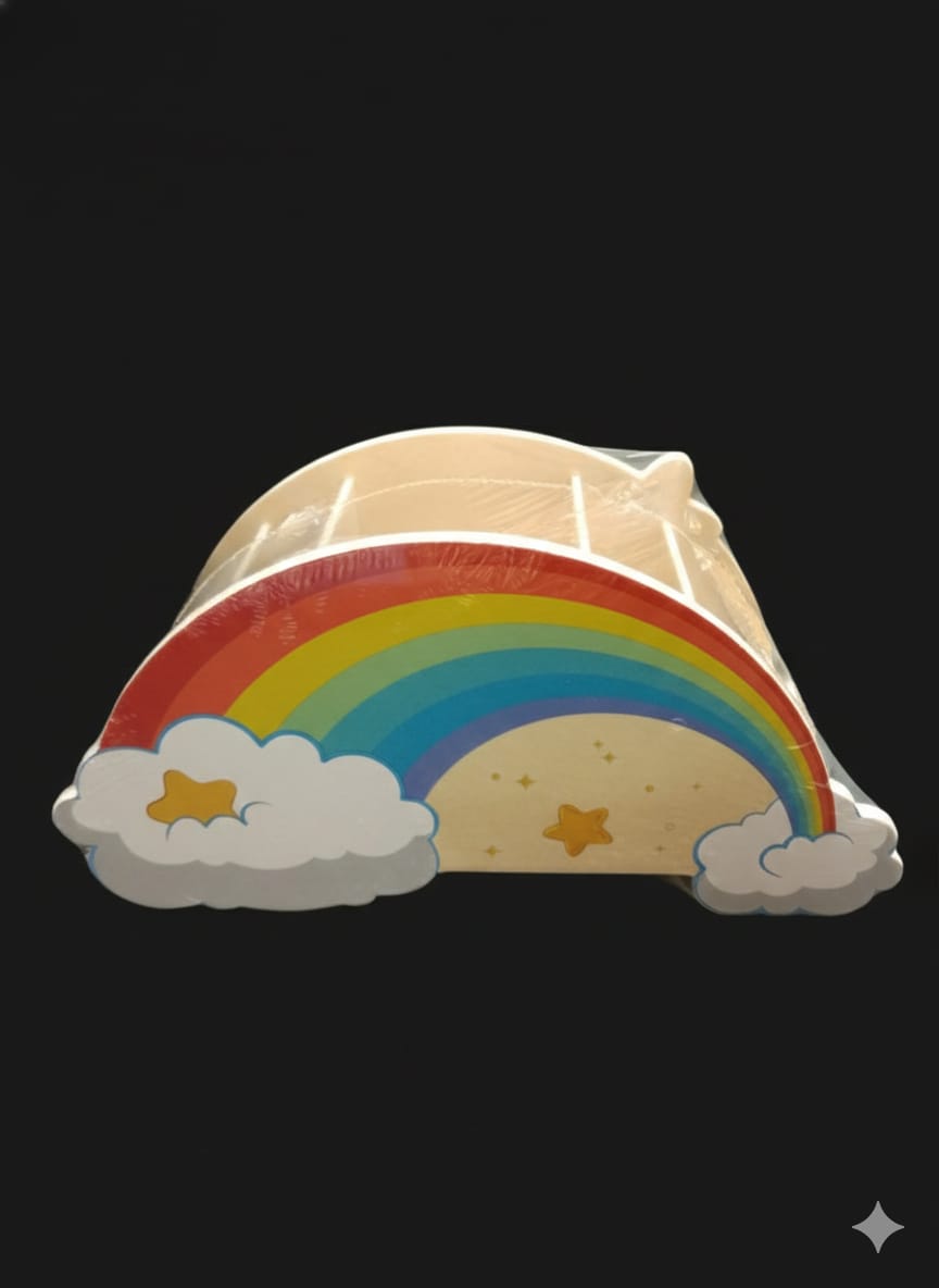 Design: Features a bright and cheerful rainbow arch design with clouds, adding a positive and creative atmosphere to any space. Material: Usually crafted from durable, non-toxic materials like wood or acrylic, making it safe for children. Organization: Designed with multiple compartments (typically 5 to 7) to organize various stationery essentials such as pens, pencils, markers, erasers, and scissors. Functionality: Serves as both a functional organizer and a delightful decor item for bedrooms, classrooms, or playrooms. Usage: Suitable for a wide range of usages in the classroom, office, restaurant, or home. Space-Saving: Compact design intended to fit perfectly on desks without taking up too much space.