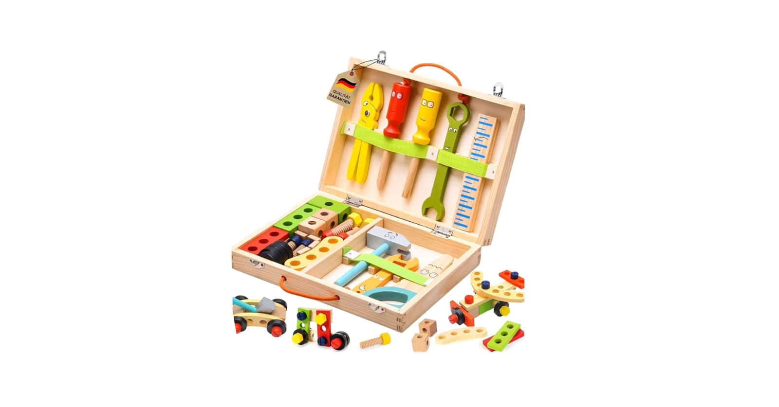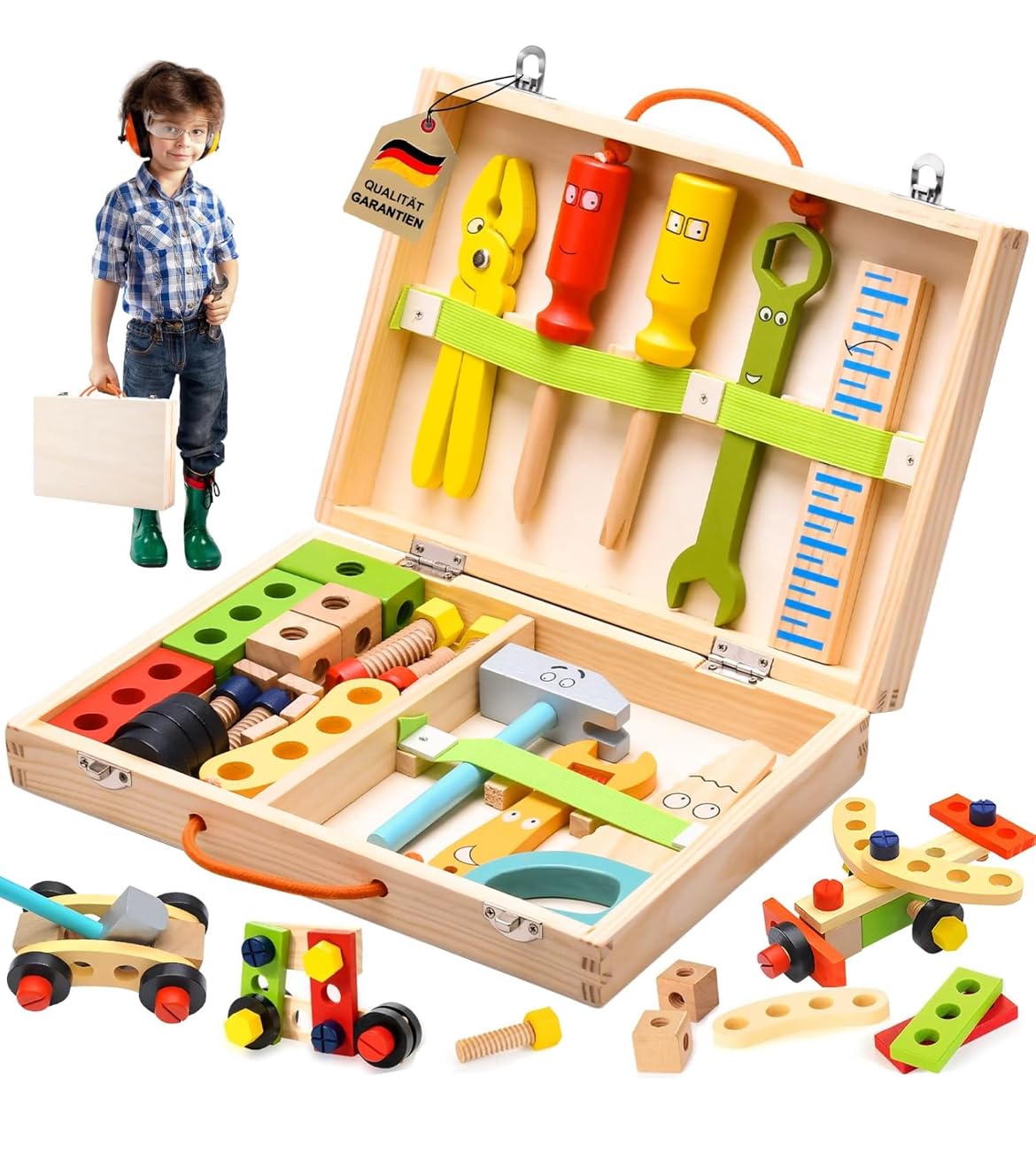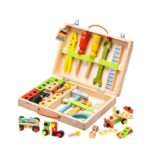 Material: The components and the case are made of wood. Portability: It comes in a sturdy wooden case with a handle for easy storage and travel. Educational Value: It is designed as an educational toy to help children with mechanic and building concepts. Contents: The set includes various toy tools and parts such as a hammer, wrenches, screwdrivers, nuts, and bolts, allowing children to build small models like the vehicles shown in the image. Age Range: It is suitable for toddlers and children across various age ranges, typically from 2 to 13 years old. Durability: The wooden construction is designed to be durable for child's play.