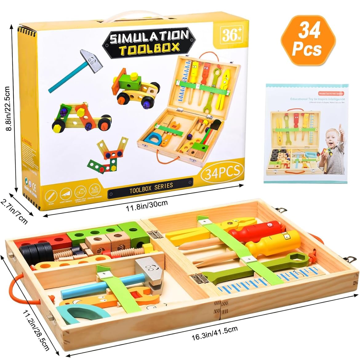 wooden “Simulation Toolbox” toy set, which is a 36-piece pretend-play kit designed for children. This all-in-one set includes various wooden tools such as a hammer, wrench, pliers, saw, ruler, and screwdriver, allowing kids to engage in hands-on learning and construction play. Made from premium, natural pine wood, the set is a durable and safe Montessori-style educational toy that helps develop cognitive skills and fine motor skills. It is designed for boys and girls aged 3 and above to inspire creativity and an introduction to basic woodworking and maintenance in a safe environment.