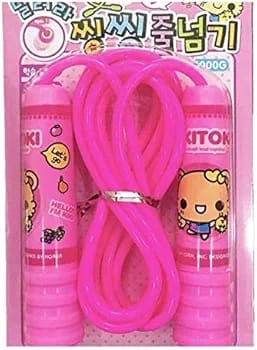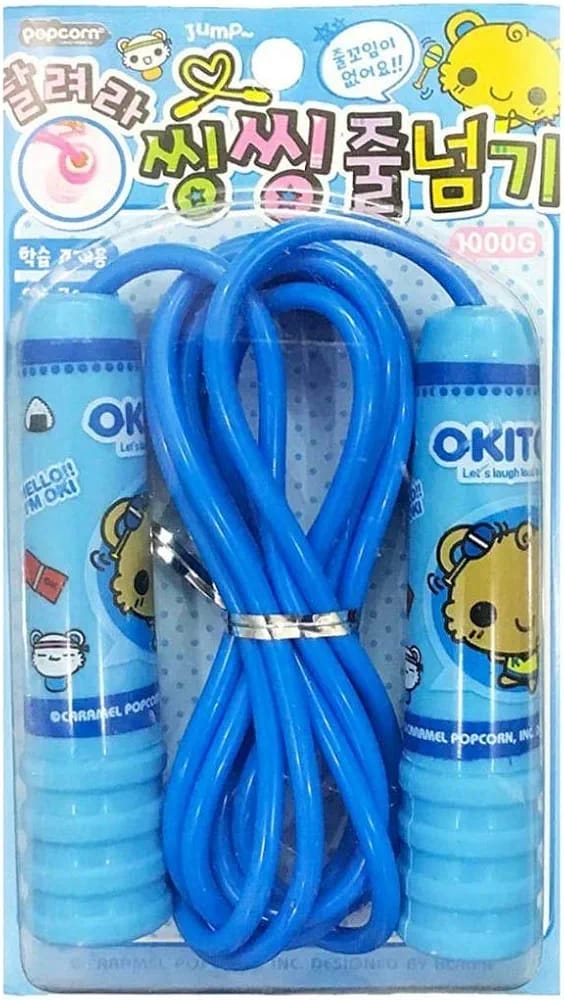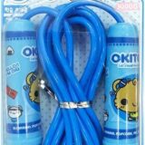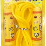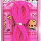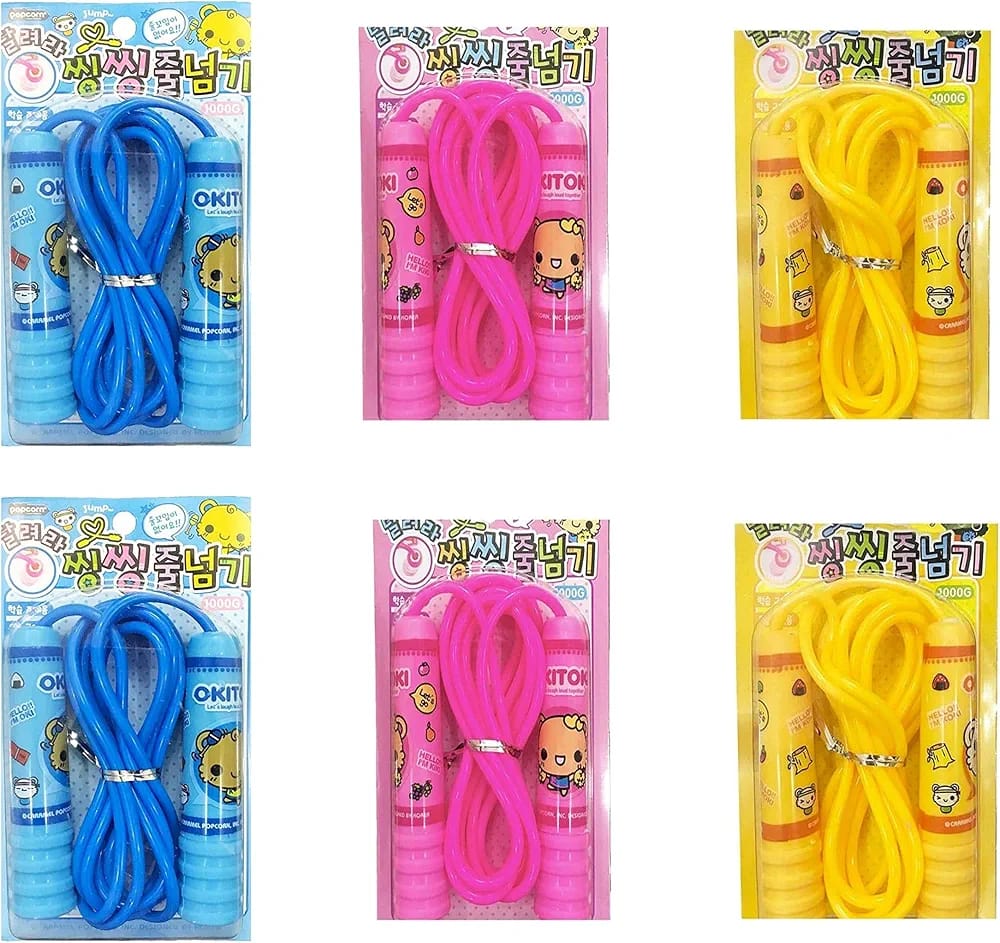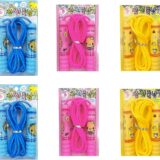 The image displays several packages of children’s skipping ropes or jump ropes in different colors: blue, pink, and yellow. The packaging is a blister pack design, with a clear plastic front showing the rope and its plastic handles, which feature a cartoon character print. The ropes are designed for kids and are often sold as return gifts for birthday parties or for general exercise and fun activities.