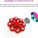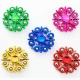Design: They have a complex, gear-like design with multiple small, metallic spheres around the perimeter and a central bearing cap. Colors: The spinners are shown in various colors, including green, blue, red, purple, and a gold or tan color. Structure: Each spinner appears to have a central body and several extensions with the metallic spheres, suggesting a unique spinning mechanism.