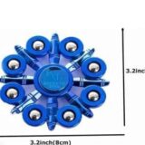This is a Multiple metal 8-ball fidget spinner. It is a type of fidget toy designed to be rotated between the fingers. It operates on principles of angular momentum and low-friction motion. Fidget spinners are often marketed for stress relief and anxiety reduction. The toy has eight weighted lobes with metal balls that rotate around a central bearing.