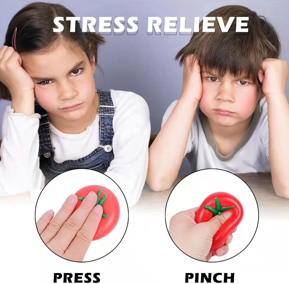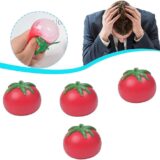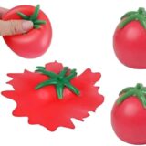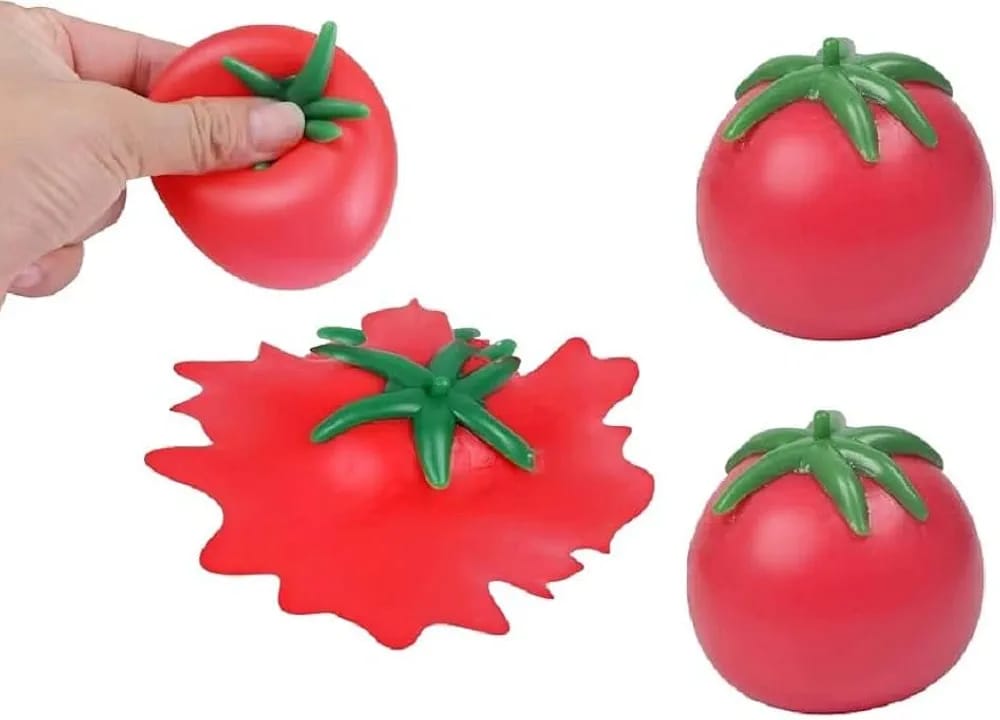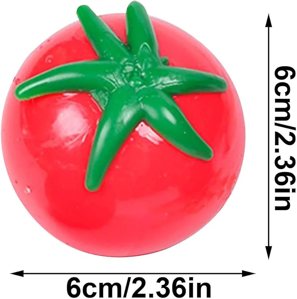 The product in the image is a small, red, tomato-shaped novelty item, likely a toy or a stress ball. It features green plastic leaves attached to the top and is entirely encased in a clear, crinkled plastic wrapping. The item has a smooth, shiny appearance beneath the wrapping, characteristic of plastic or rubber material.