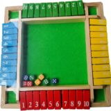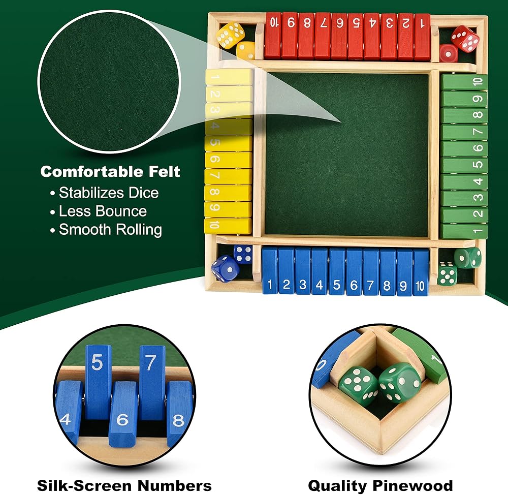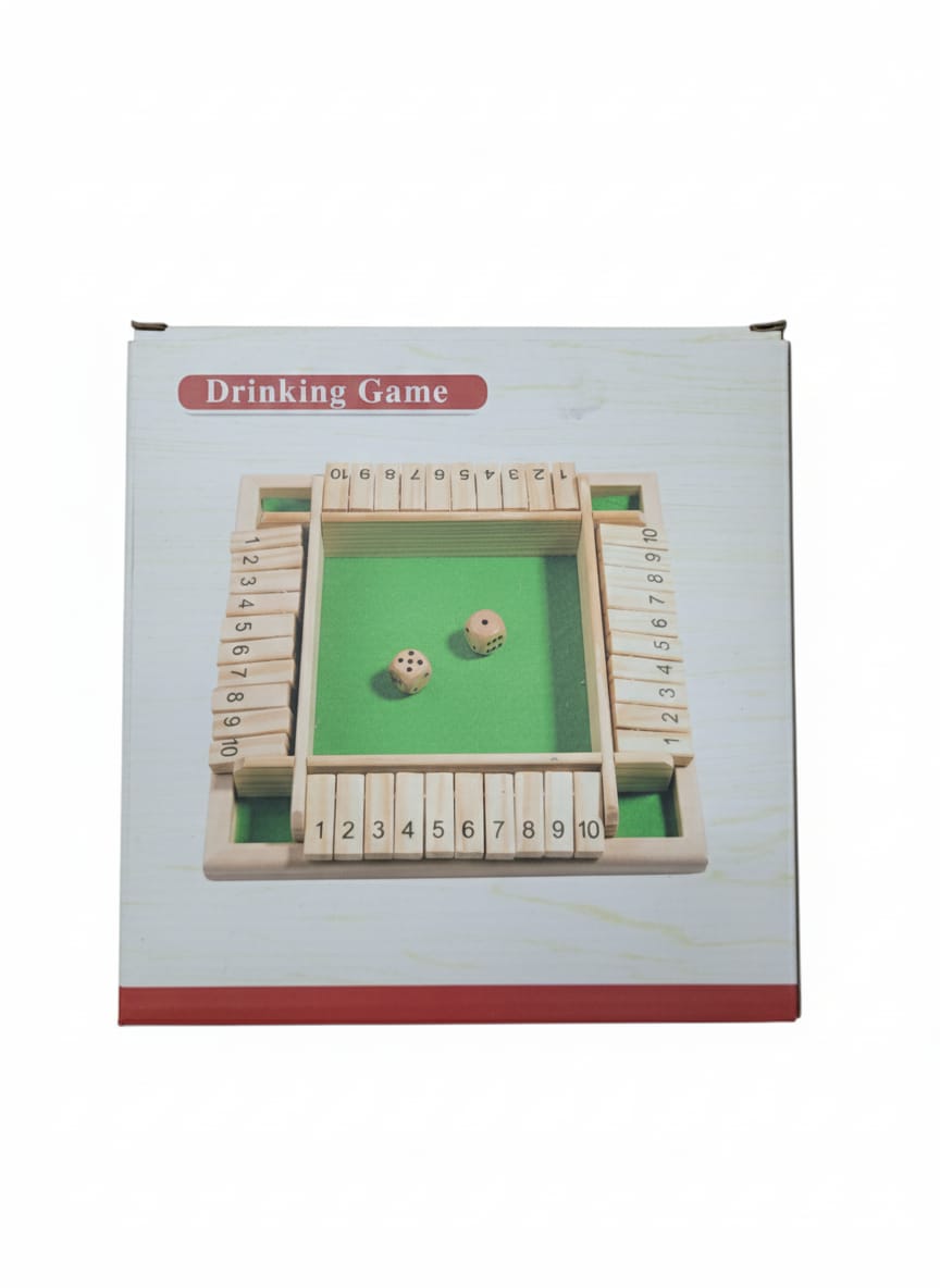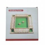 The image displays a classic wooden “Shut the Box” game, which is a popular board game also marketed as an interactive party drinking game. The game board is typically crafted from sturdy wood and features a green felt surface in the center. It has numbered tiles or cards, from 1 to 10, arranged along the sides. Players roll dice and cover the corresponding numbers, making it a tool for teaching basic arithmetic and logical thinking skills to children, as well as a fun activity for adults at social gatherings. The game is designed for multiple players and encourages friendly competition and engagement.