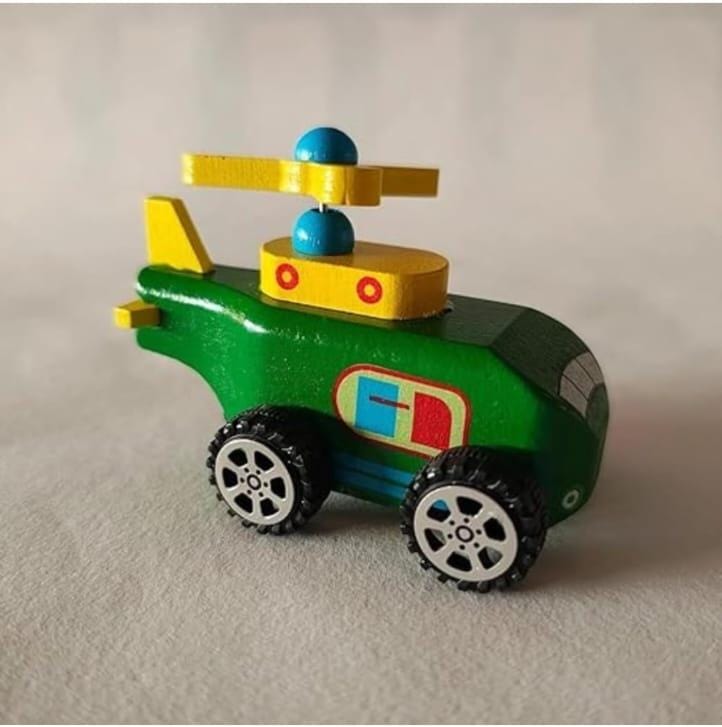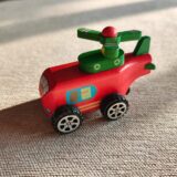 The image displays a small, red, wooden toy helicopter resting on a textured, light-colored surface. The toy features green accents on its top-mounted propeller and tail fin, with a small red dome at the propeller’s center. It has black wheels with silver-colored hubcap details and a small blue and yellow graphic on its side, resembling a window or door. Similar items are often pull-string or pull-back toys made from safe, durable wood with non-toxic coatings, designed to encourage motor skills and imaginative play in young children.